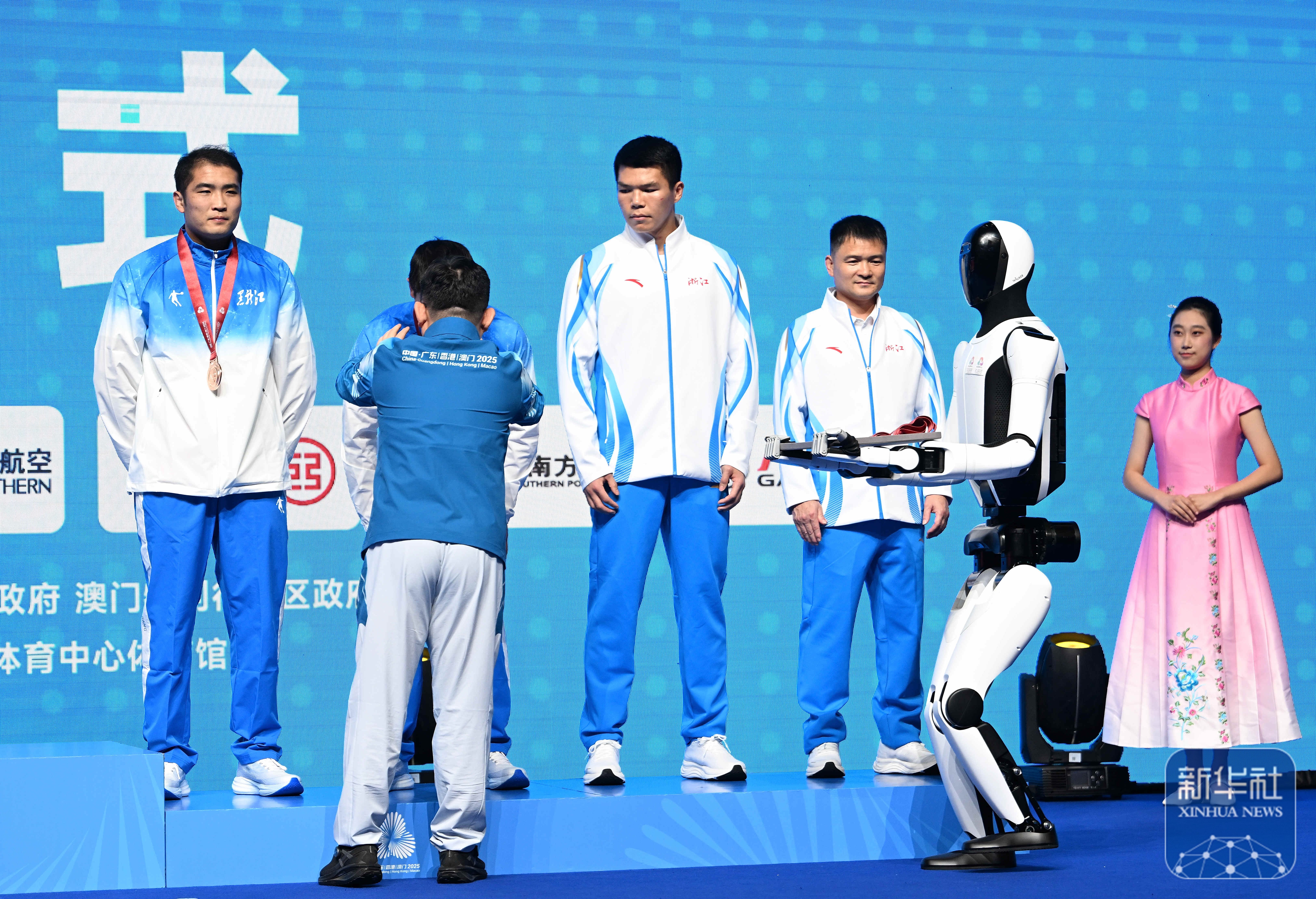 11月14日,人形机器人亮相第十五届全国运动会拳击男子92公斤级颁奖仪式。
