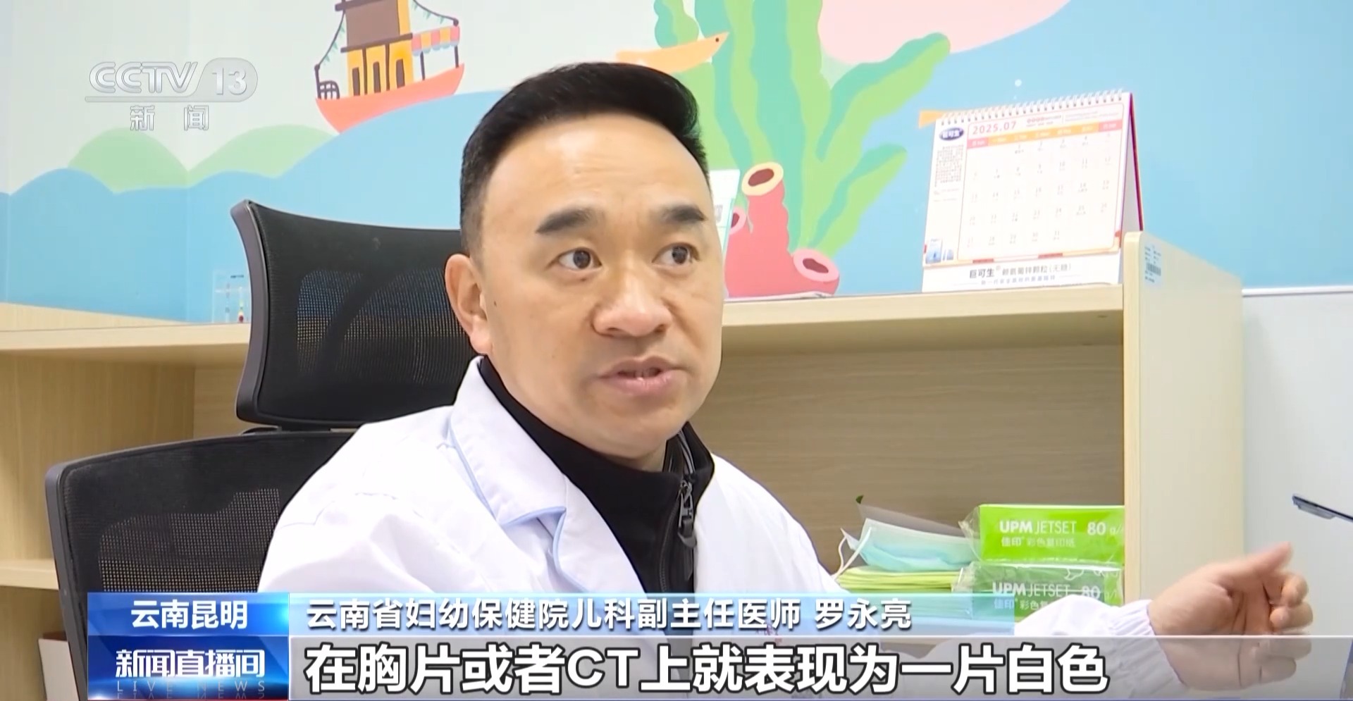 云南省妇幼保健院儿科副主任医师 罗永亮:严重的肺炎,面积比较大,肺泡里充满了炎症分泌物,密度比较高,在胸片或者CT上就表现为一片白色,医学上就俗称为“白肺”。如果小孩有呼吸增快,那么这也是呼吸不好的表现。缺氧,大家比较好判断,就是脸色苍白,发灰,甚至鼻翼,指端发绀、发青。