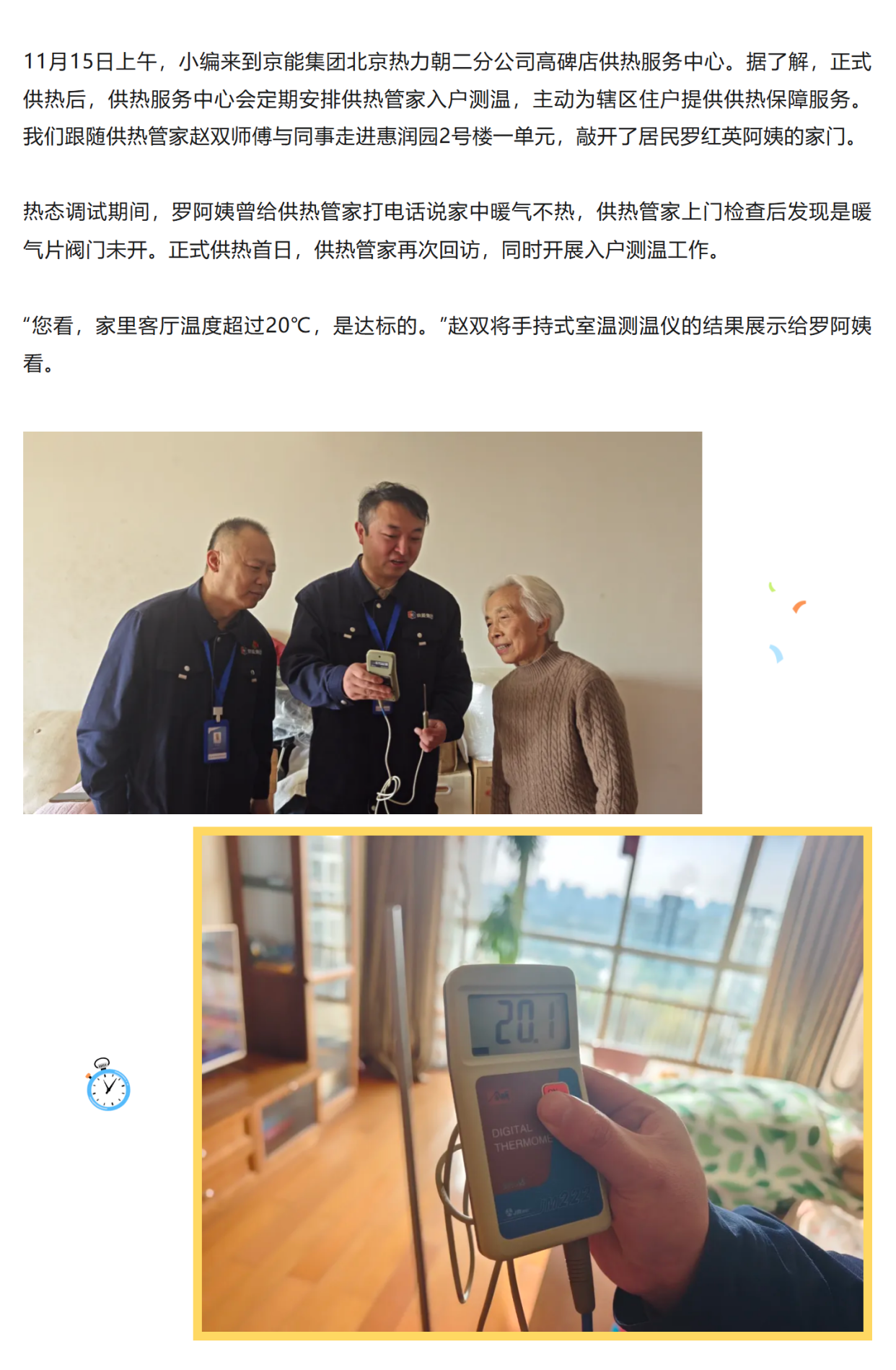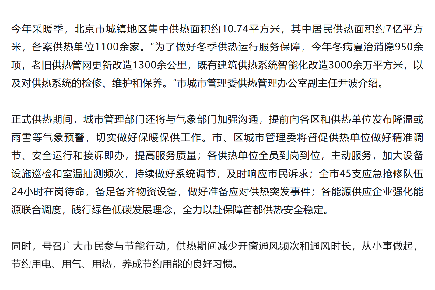 正式供热后,北京热力将持续聚焦市民用热需求,一方面加密供热设备设施巡检频次,对管网、换热站等关键点位开展常态化排查,发现问题立即整改;另一方面将密切跟踪天气变化趋势,动态优化供热运行策略,精准调整管网参数,实现“室外气温波动、室内温度稳定”的保障目标。