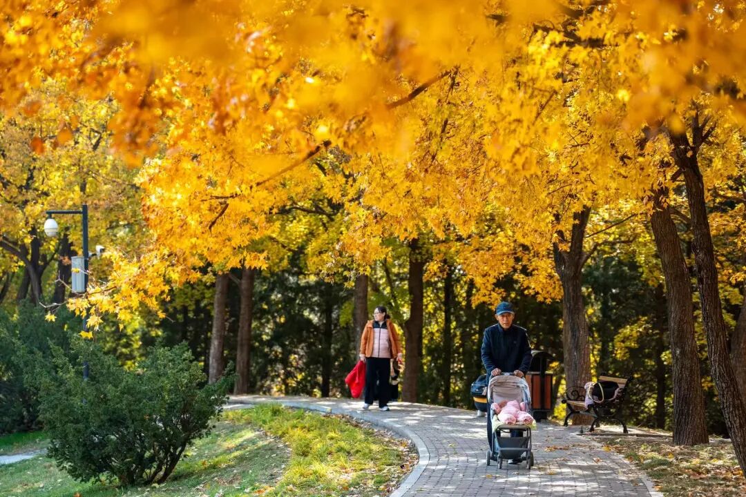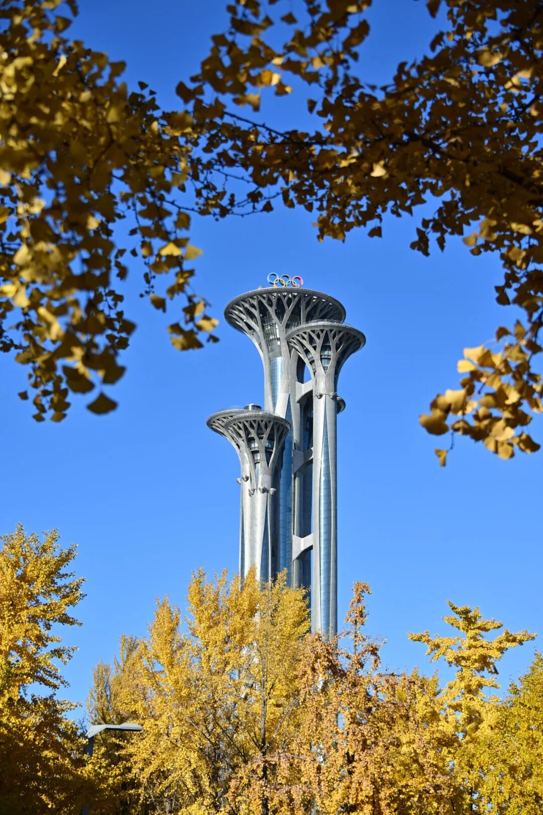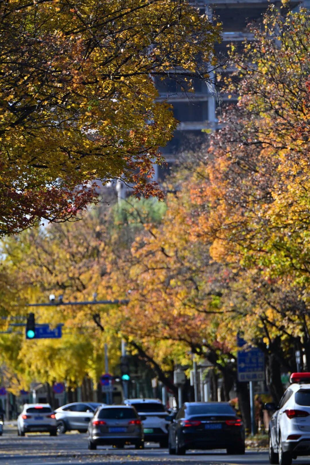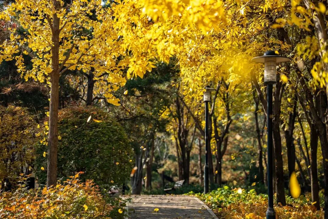 亮马河水面静如镜鉴,映着两岸金黄枝叶