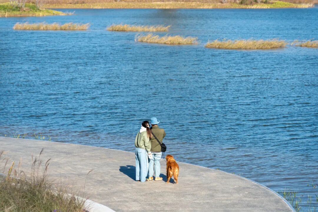 行人悠然漫步,或并肩闲谈,或独自赏景