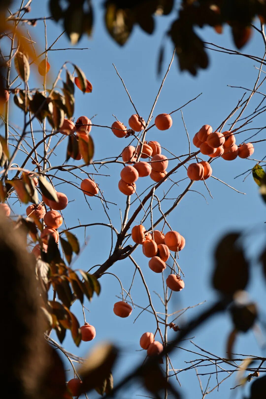 枝头熟柿如橘红小灯笼,透着丰收暖意