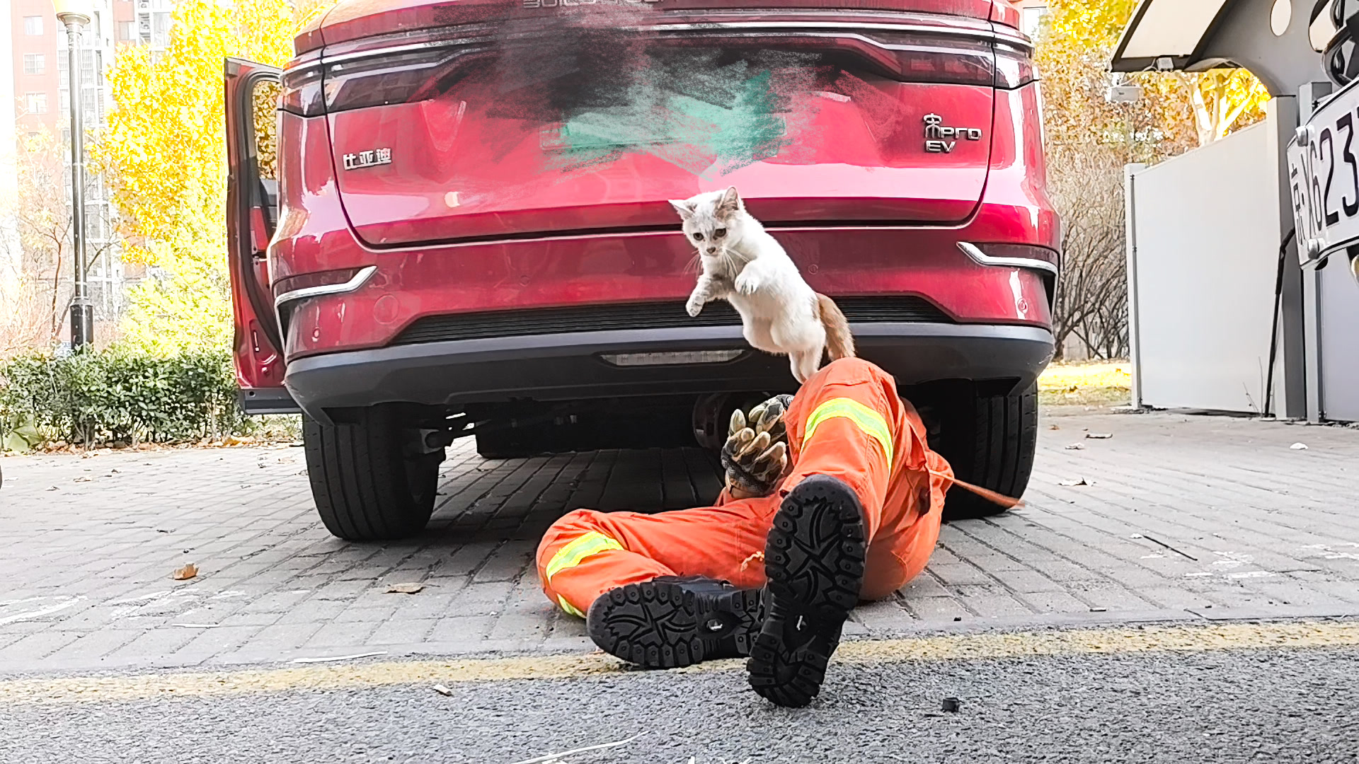 11月16日,北京经开区,消防员从一辆私家车车底救出一只被卡的小猫。消防员提醒,天气转冷,小动物喜欢藏在车底取暖,车主可轻敲车身,绕车检查后再启动车辆。