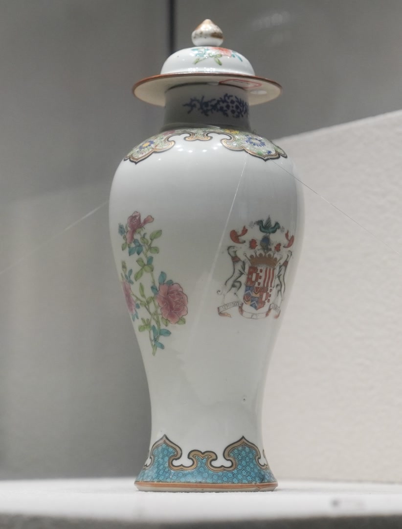 精致的纹章瓷是中外文化互鉴、交流、融合的重要物证。一件清乾隆广彩武德家族纹章纹盖瓶,是第四代潘默尔伯爵威廉·武德定制的。他是汉诺威王朝时期英国皇家卫队成员,因屡立战功,晋升为将军,并授予爵位。瓶身一侧为伯爵纹章,另一侧为折枝牡丹纹。