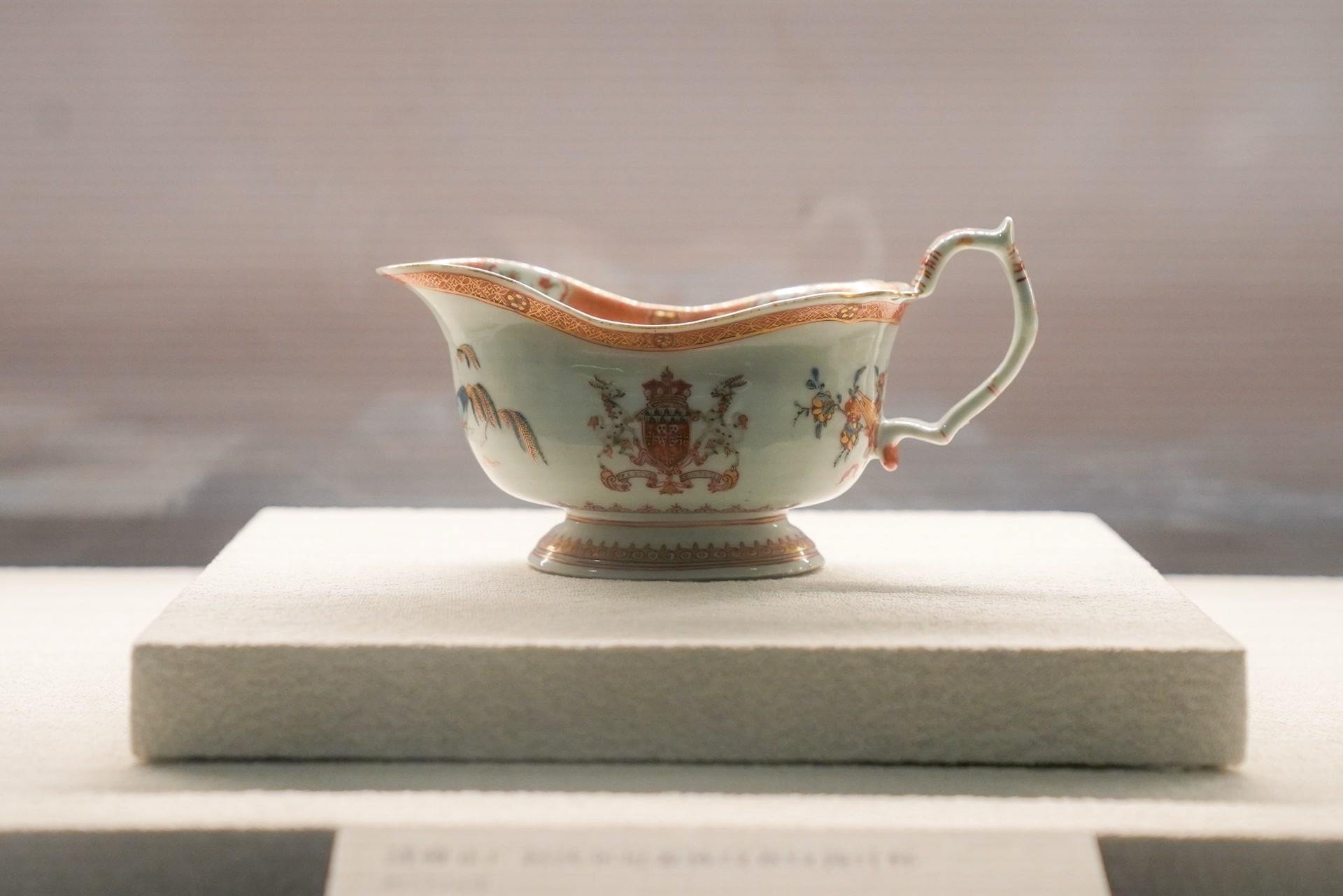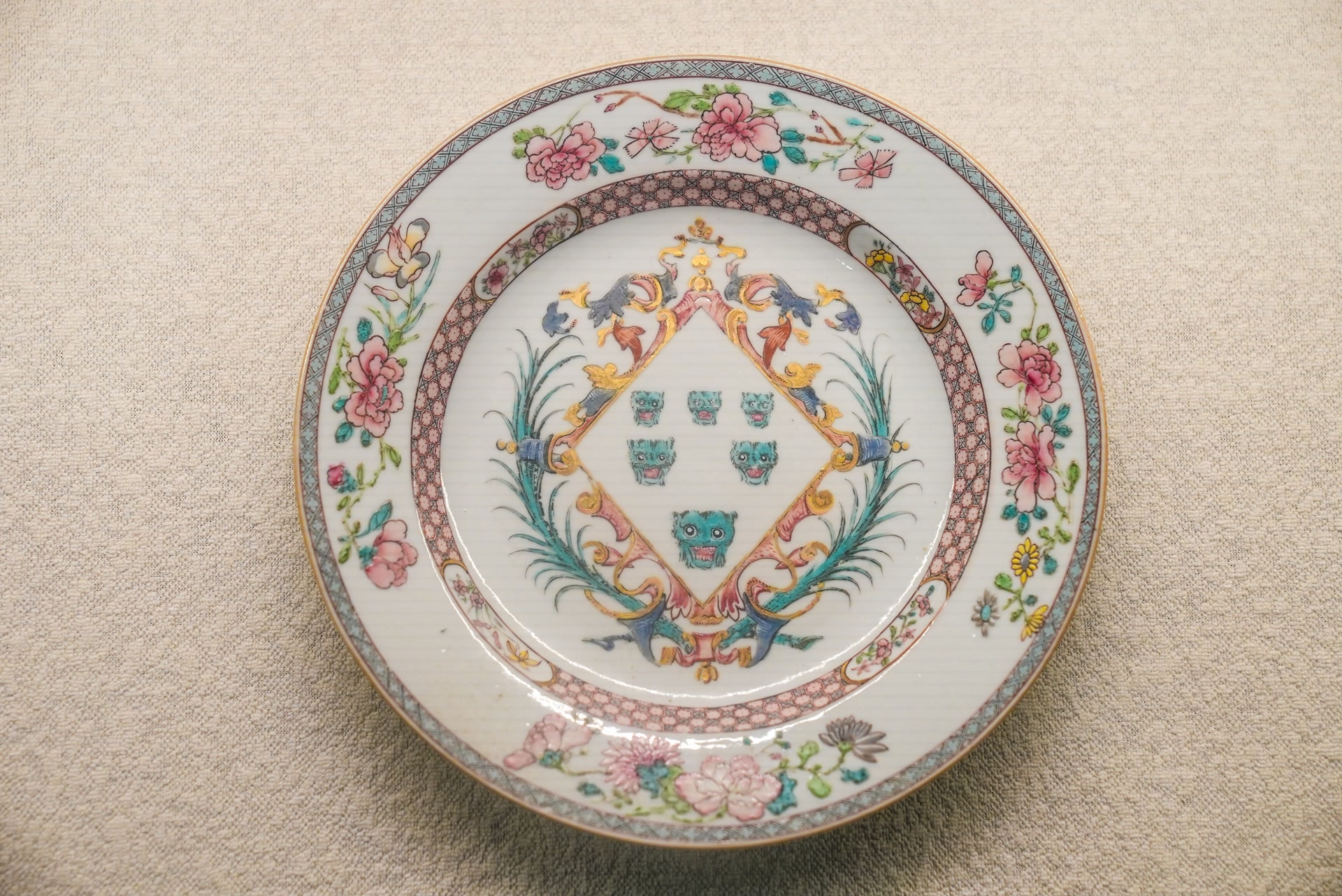 纹章瓷是中国古代外销瓷的一种,因表面绘有欧洲贵族纹章图案得名。其历史可追溯至明嘉靖时期,清康熙年间发展至鼎盛。这类瓷器由中国工匠按照国外订购商提供的造型、式样、纹饰等进行彩绘烧制,既有中国传统制瓷工艺的特点,又能反映出当时欧洲贵族的装饰审美意趣。