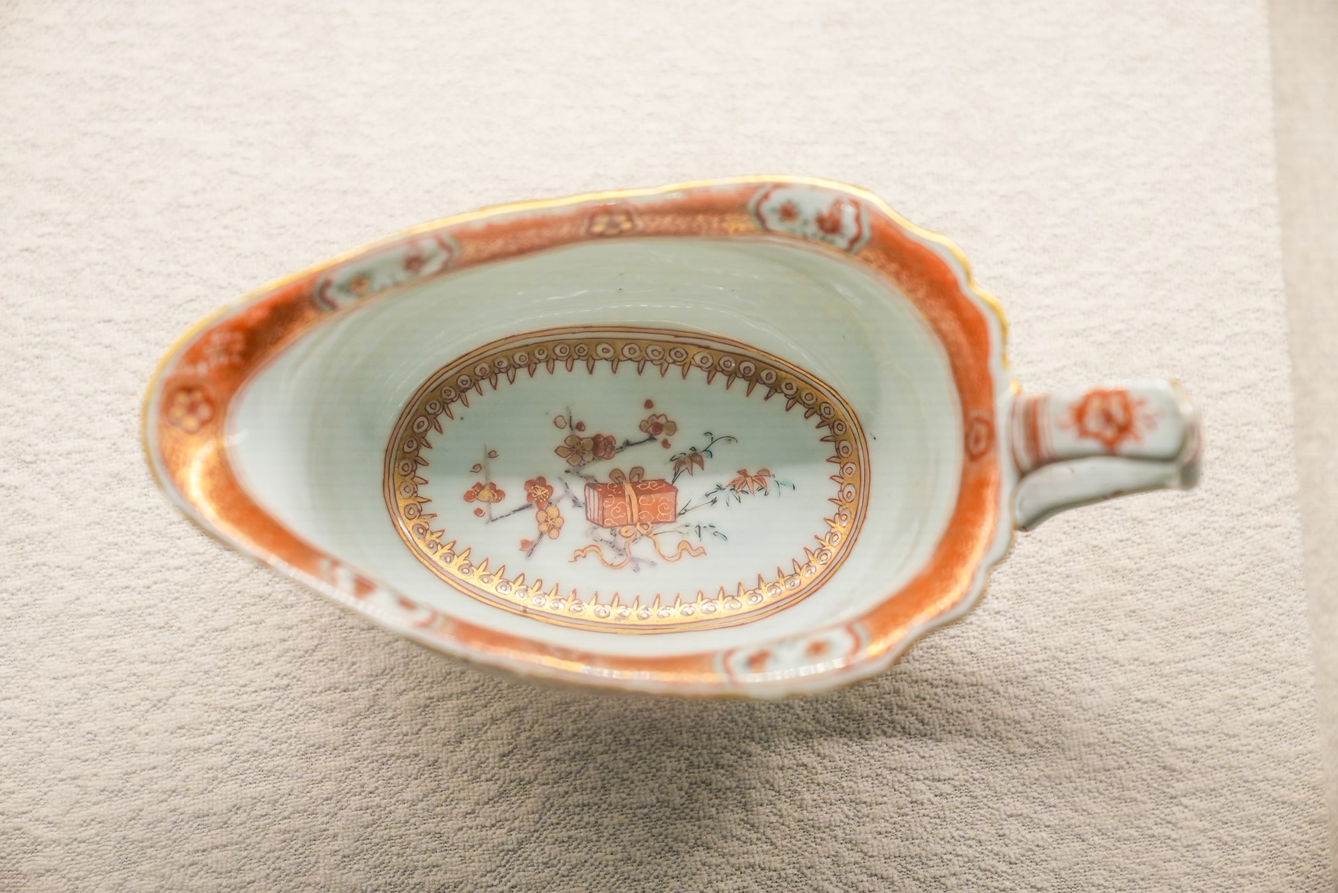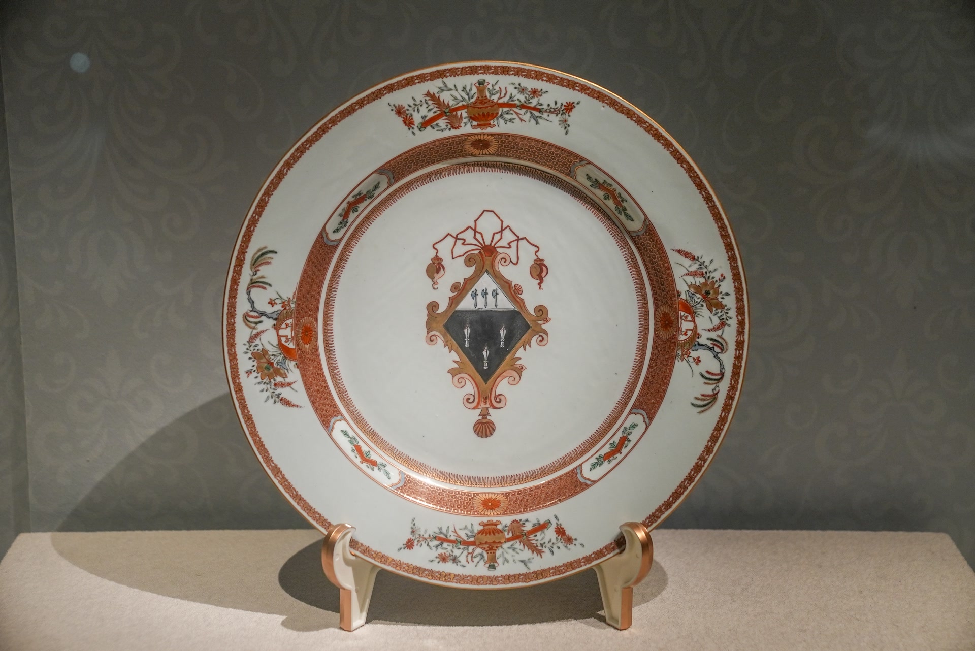 这些瓷器为铁红描金风格,巴洛克式纹章绘制极为精细,盘沿绘中国传统纹样。