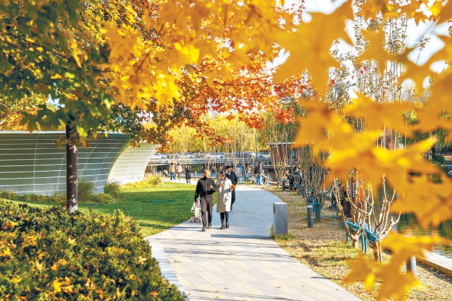 亮马河仍然是赏秋的顶流。80万平方米的水岸被草木染上浓郁的色彩,梧桐树变成时尚的美拉德色系,水中残荷如同一幅画。今年,坝河21公里的绿道贯通了,一路起伏蜿蜒,特别适合骑行。