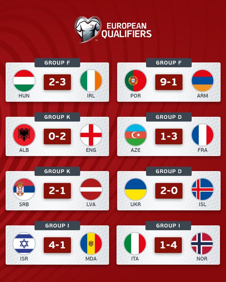 当天其他场次方面,提前晋级的英格兰队,凭借哈里·凯恩的进球,2比0客胜阿尔巴尼亚队,法国队则以3比1战胜了阿塞拜疆队。乌克兰队2比0战胜冰岛队,获得附加赛资格。塞尔维亚队2比1击败拉脱维亚队,以色列队4比1战胜摩尔多瓦队,这4队均已提前无缘世界杯。