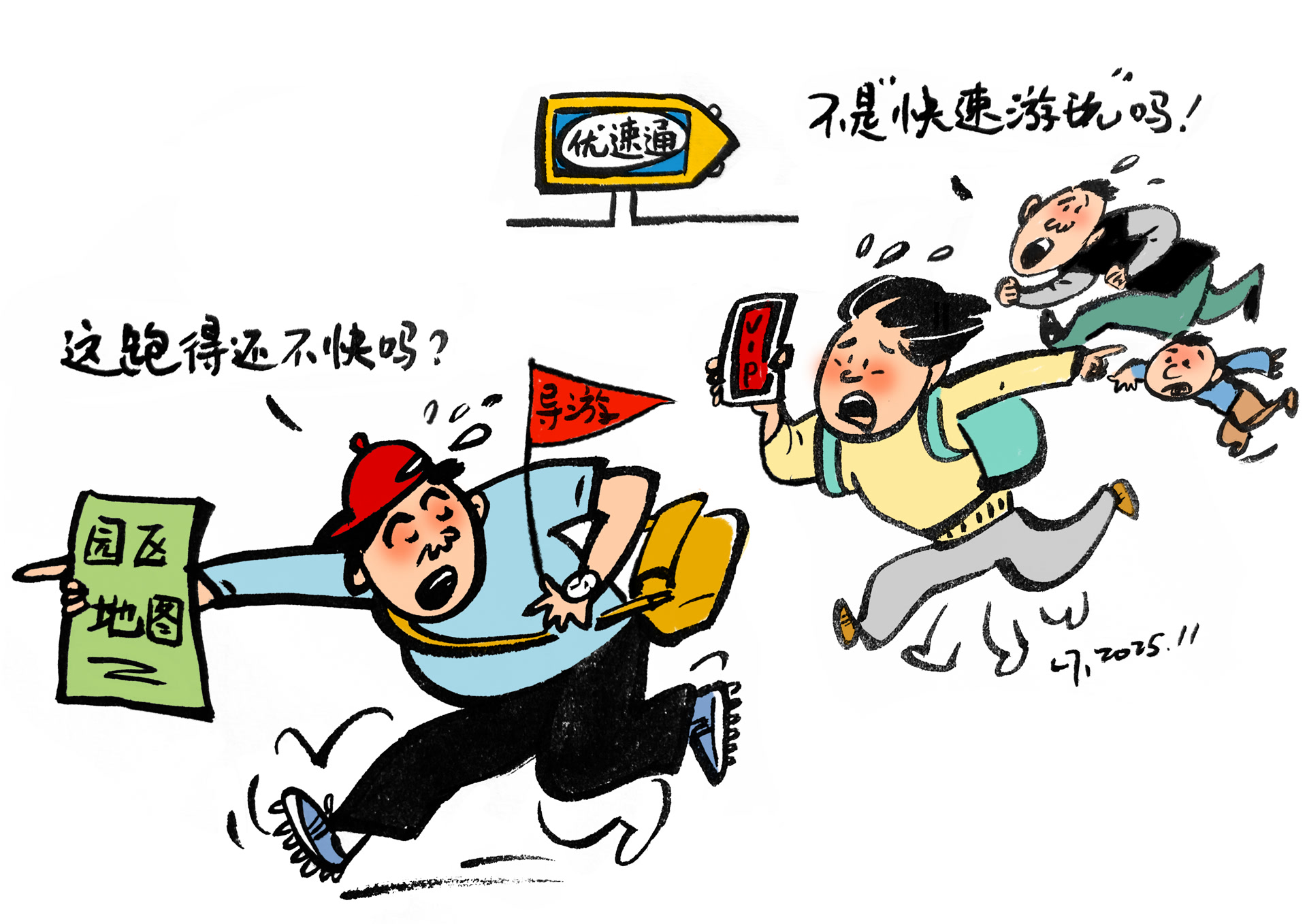 不少消费者反映,一些第三方平台推出的景区“快通”“快速游玩”等服务,让游客误以为是官方授权的免排队服务,其实是导游带着在景区里四处奔跑,打时间差。商家玩“文字游戏”,是典型的虚假宣传或误导性宣传。消费者购买时,要核实清楚,切莫买了快通反而不痛快。