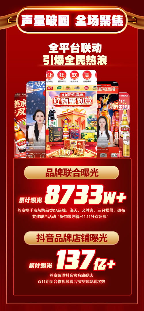 燕京啤酒还通过跨品类合作实现品牌曝光升级,联合海天、必胜客、三只松鼠、斑布等品牌共建“好物聚划算—11.11狂欢盛典”,累计品牌联合曝光量超8733万次。同时,抖音平台品牌店铺曝光量突破137亿次,形成线上线下全域营销矩阵。