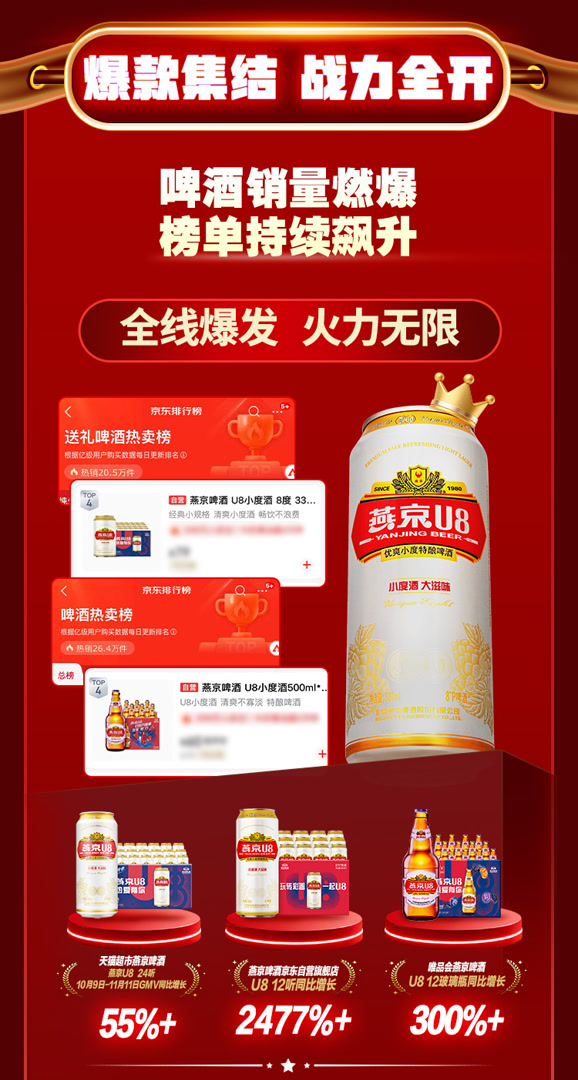 燕京啤酒的产品销量与榜单表现尤为突出。其中,燕京 U8 系列表现强劲,天猫超市燕京啤酒10月9日—11月11日GMV同比增长超过55%;燕京啤酒京东自营旗舰店U8 12听同比增长超过2477%;唯品会燕京啤酒U8 12玻璃瓶装同比增长超过300%。