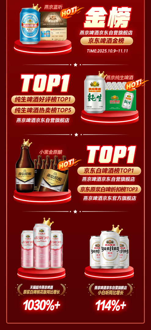 2025年“双十一”期间,燕京啤酒交出了一份亮眼的成绩单,全渠道表现势如破竹,多款产品在榜单上持续攀升,品牌声量也实现破圈传播。