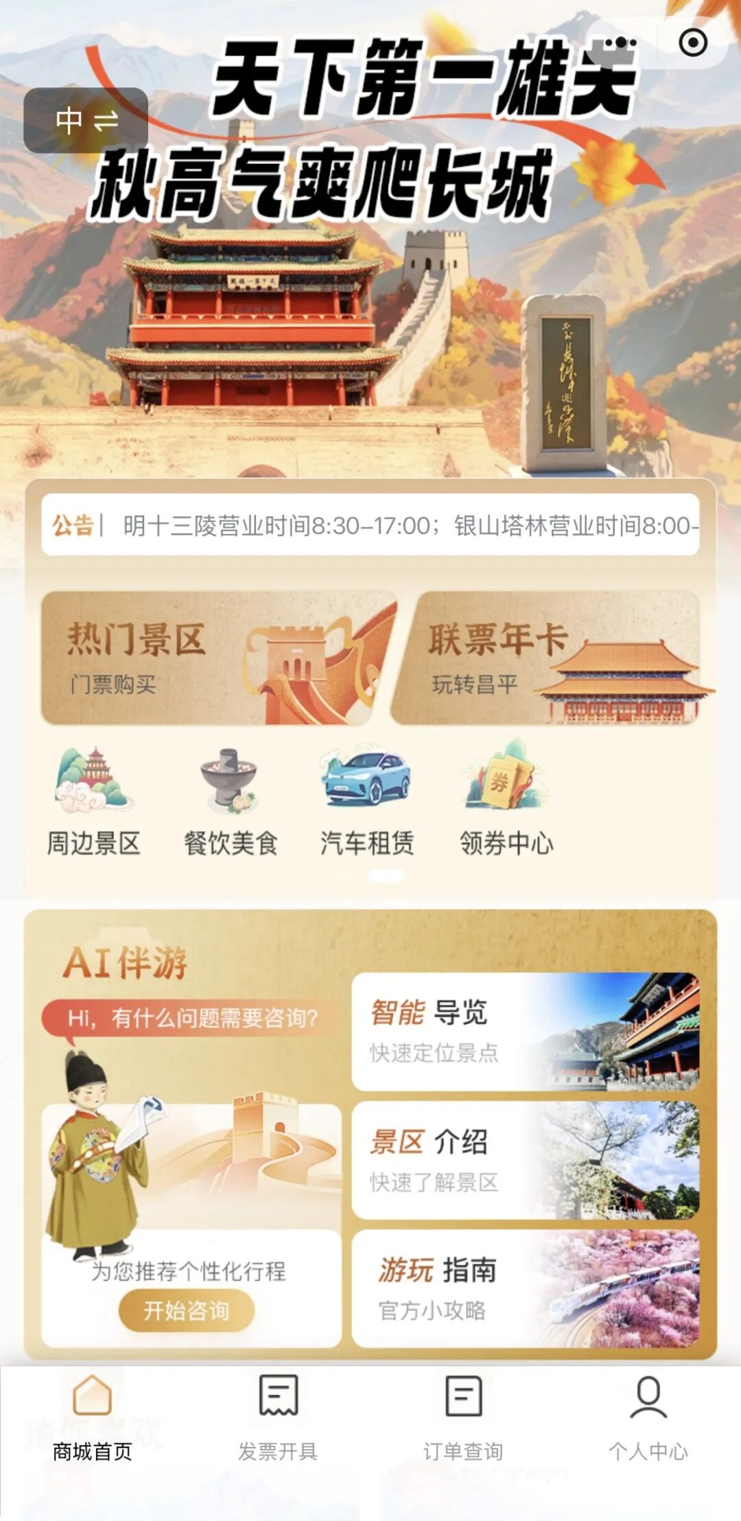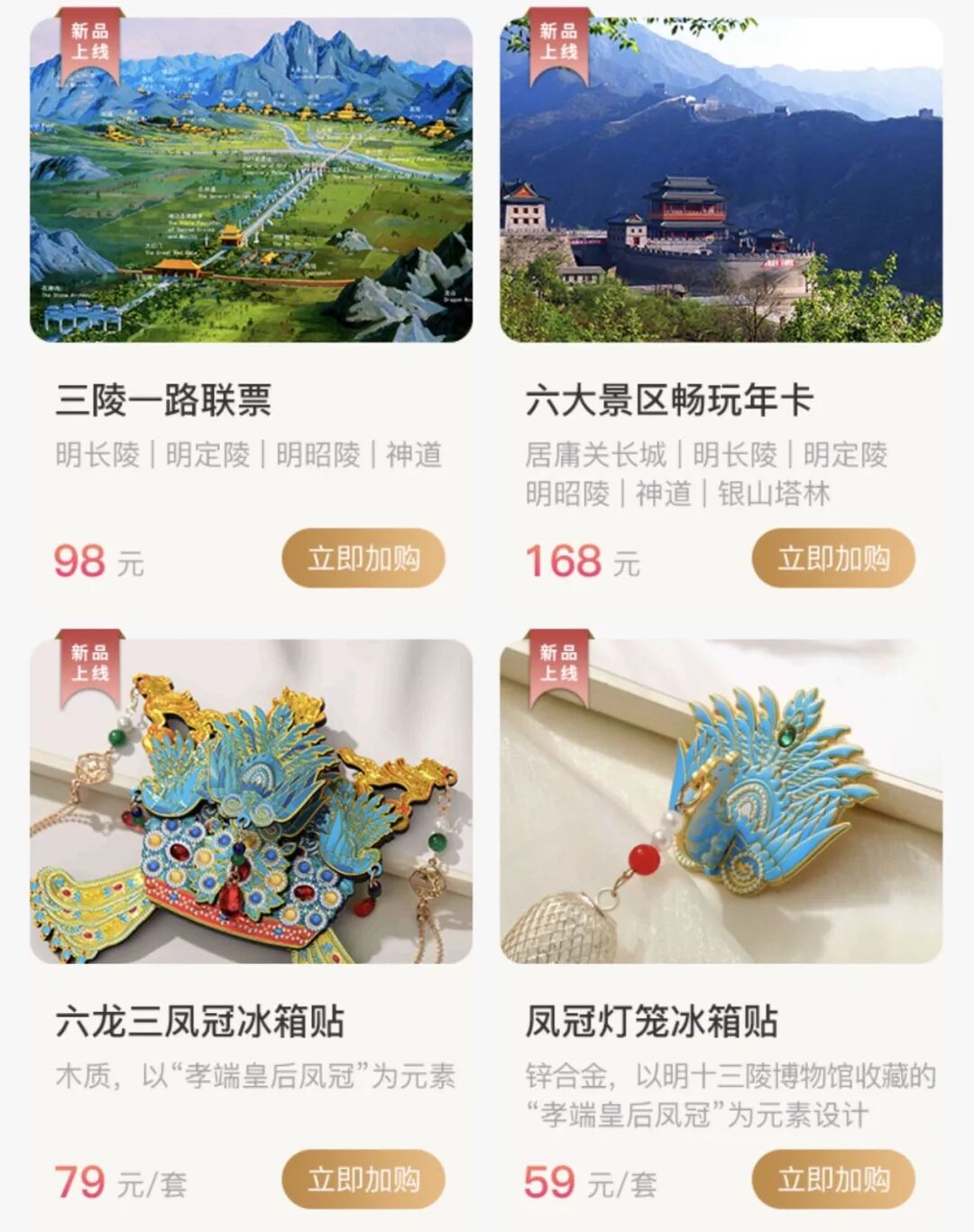 除了景区服务,小程序还整合了昌平全域旅游配套资源:从景区周边的庭院民宿到高品质度假酒店,从康陵春饼宴、阳坊涮肉等特色美食到凤冠冰箱贴、长城文创等网红纪念品,均可一键查询、预订。