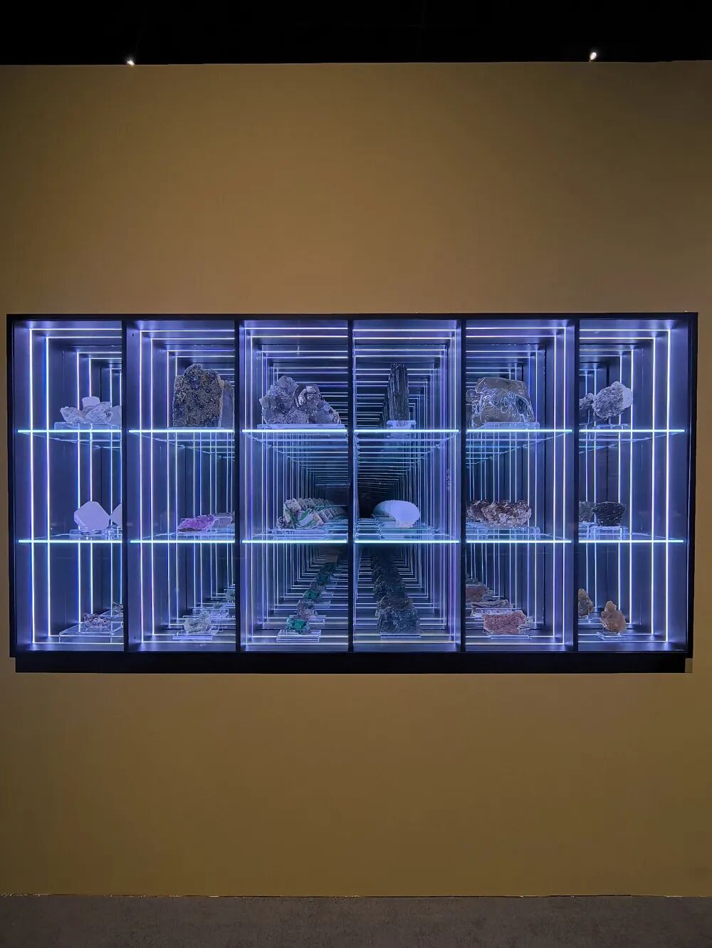 第四单元“岩矿撷萃”为观众奉上了一场视觉与互动的盛宴。“遇见古海精灵”展出来自摩洛哥、距今约4.2亿年的直角石化石,仿佛在邀请观众与史前海洋生灵展开一场跨越时空的奇妙对话;“光影迷宫”则通过精心设计的光影装置,营造沉浸式的观展体验。