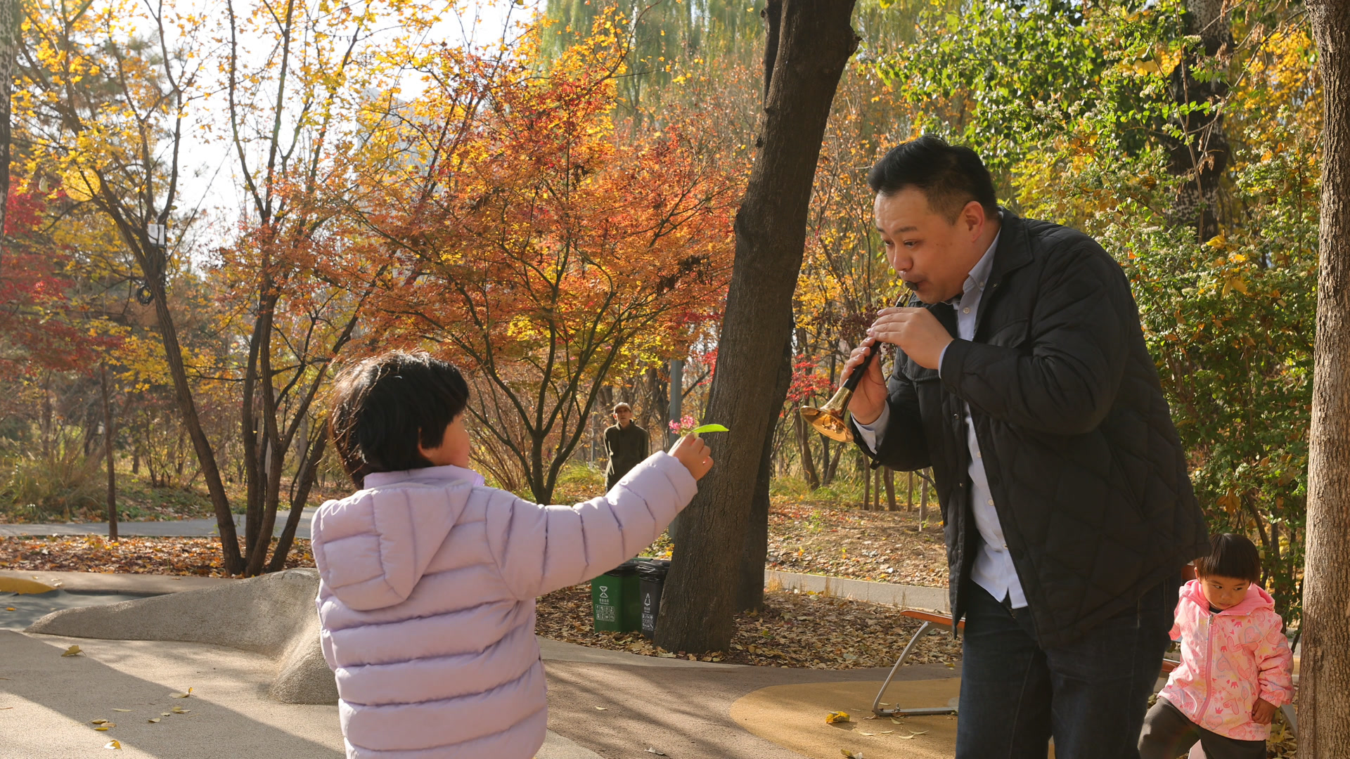 11月15日,西城区广阳谷城市森林公园里的景象同样动人。暖阳下,北京民族乐团唢呐演奏家王向阳用《百鸟朝凤》里酷似鸟鸣的吹奏,率先吸引了健身区中做游戏的小朋友们。渐渐地,公园里锻炼的市民、推着婴儿车的家长,以及附近等车的行人都循声而来。