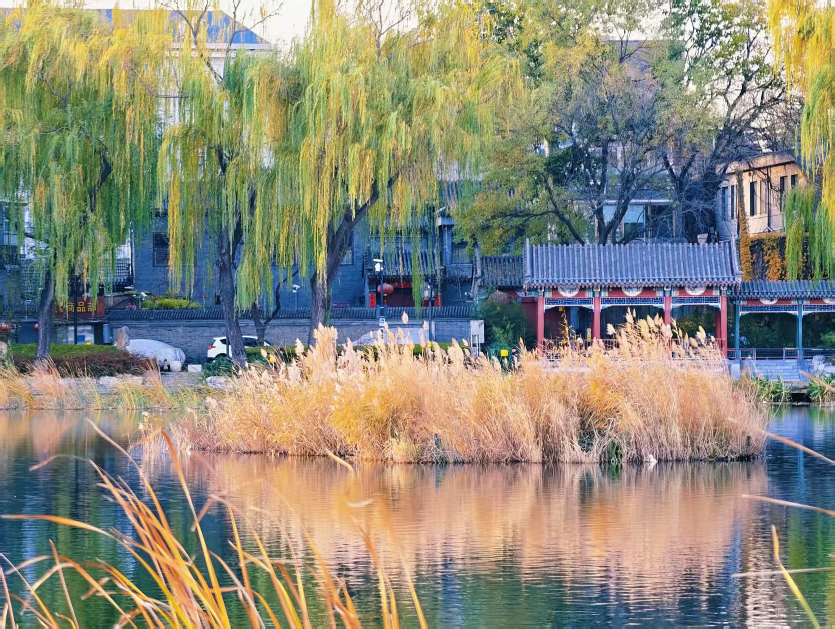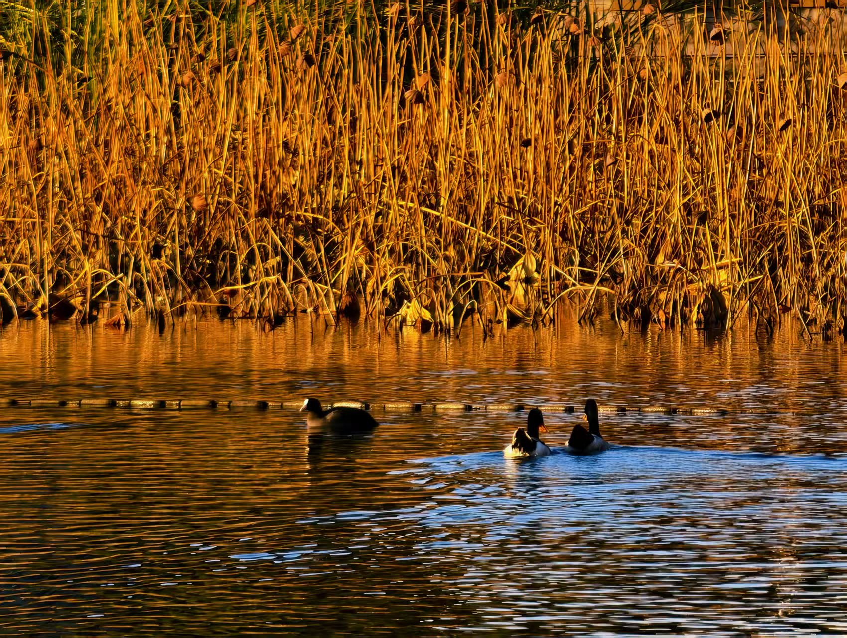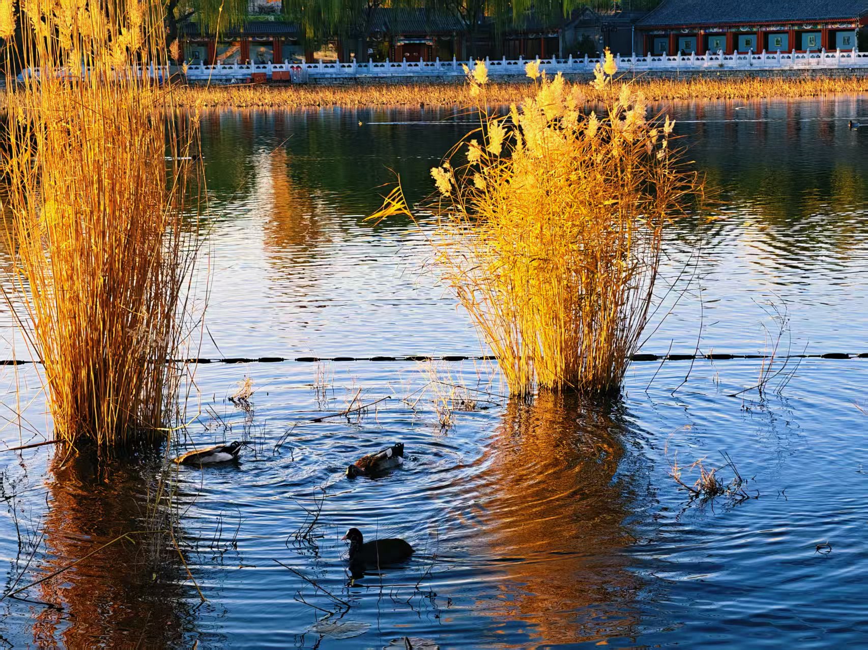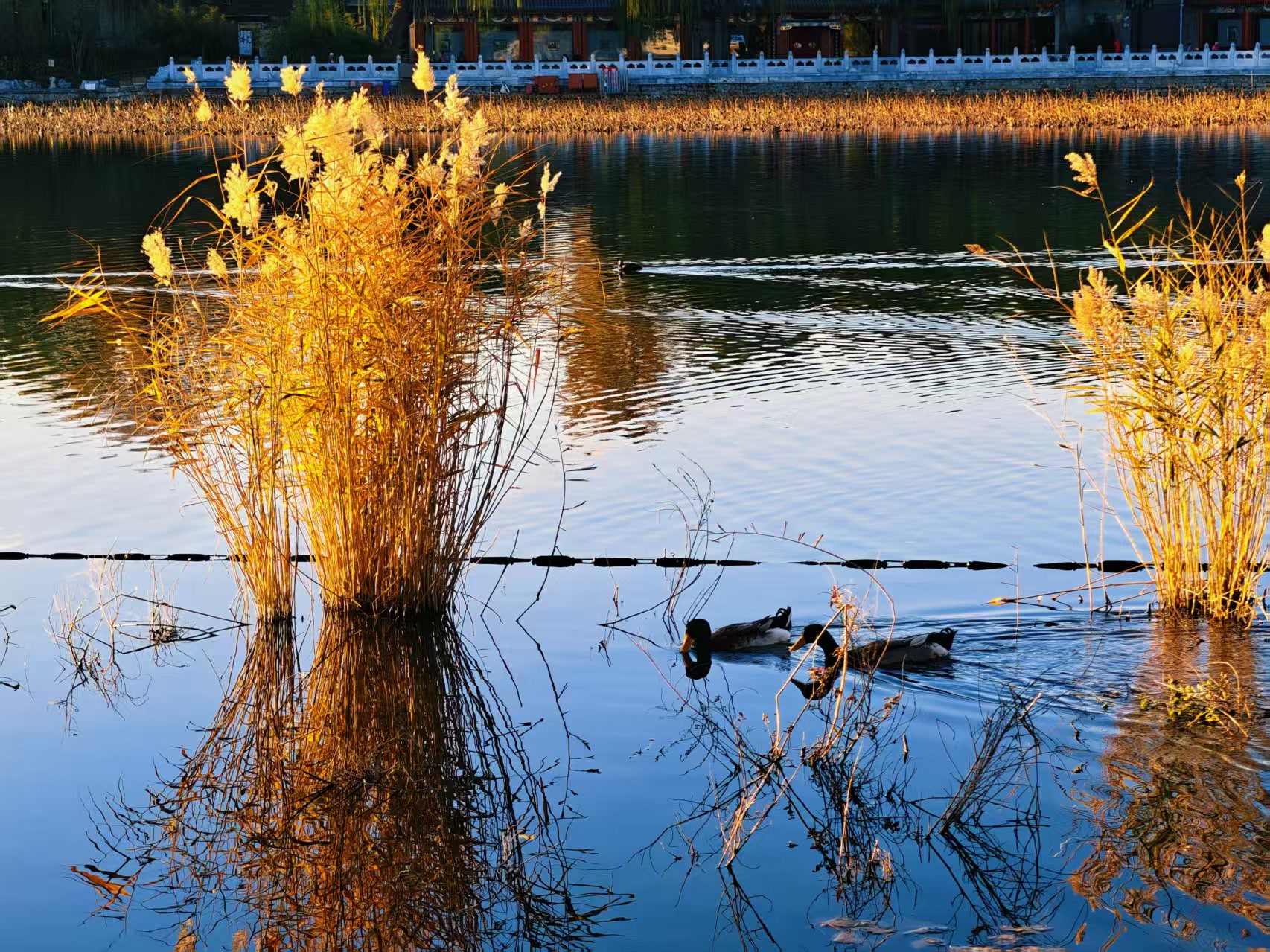 晨光初绽,什刹海西海湿地。成片的芦苇在光晕中泛着迷人金色,随风轻摇似在低吟。水面如镜,宁静无波,倒映着天空与芦苇的影子。偶尔有水鸭掠过,惊起丝丝涟漪,好一幅浑然天成的绝美自然画卷。