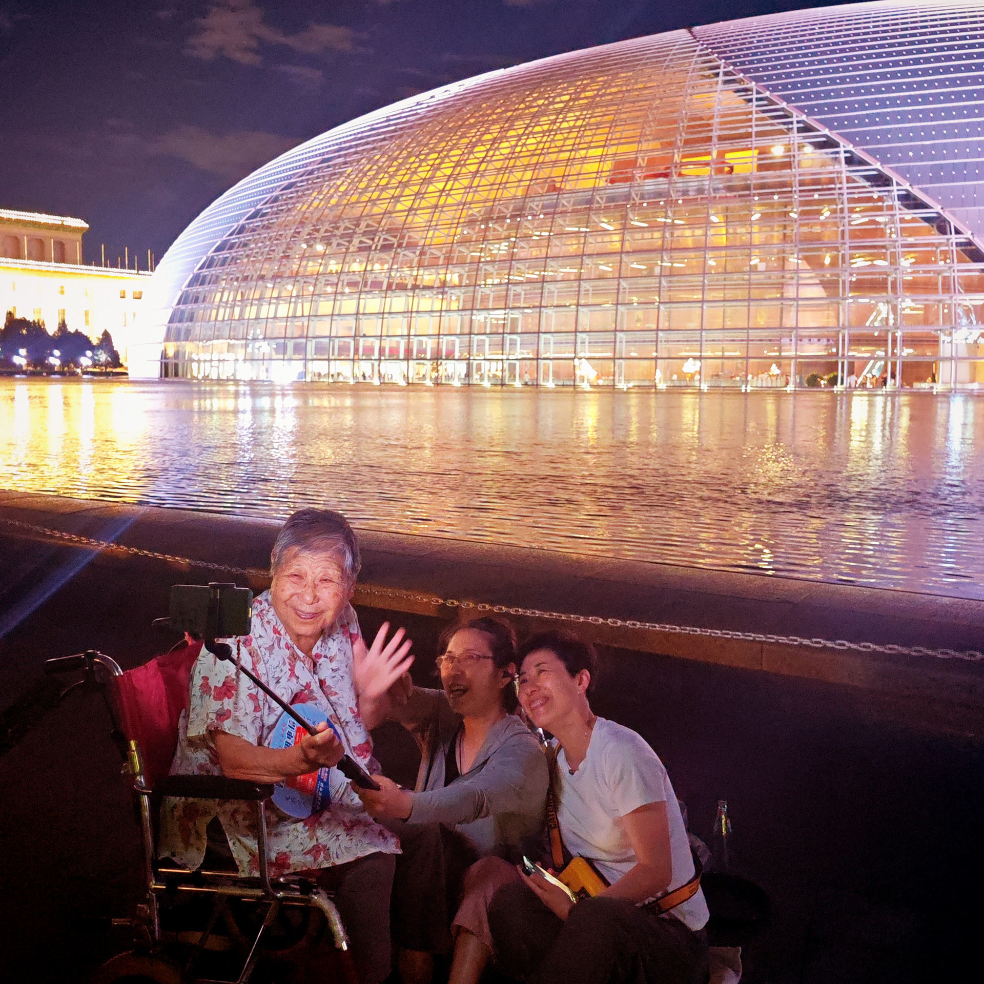 一位坐着轮椅的老奶奶在家人陪伴下早早来到国家大剧院“人工湖”畔等候亮灯。灯亮了,银发映照着流动的华彩,老奶奶手扶家人举着的自拍杆,笑意从心底涌出。她对着镜头,一边挥手致意,一边指挥着家人:“靠近些,都笑开些呀!”此时此刻,她把巍峨建筑从容化作了亲情的温存布景,这笑容是岁月酿出的蜜糖,这挥手是时光沉淀下来的爱意。老奶奶的从容,盛放了一个家族的笑声。