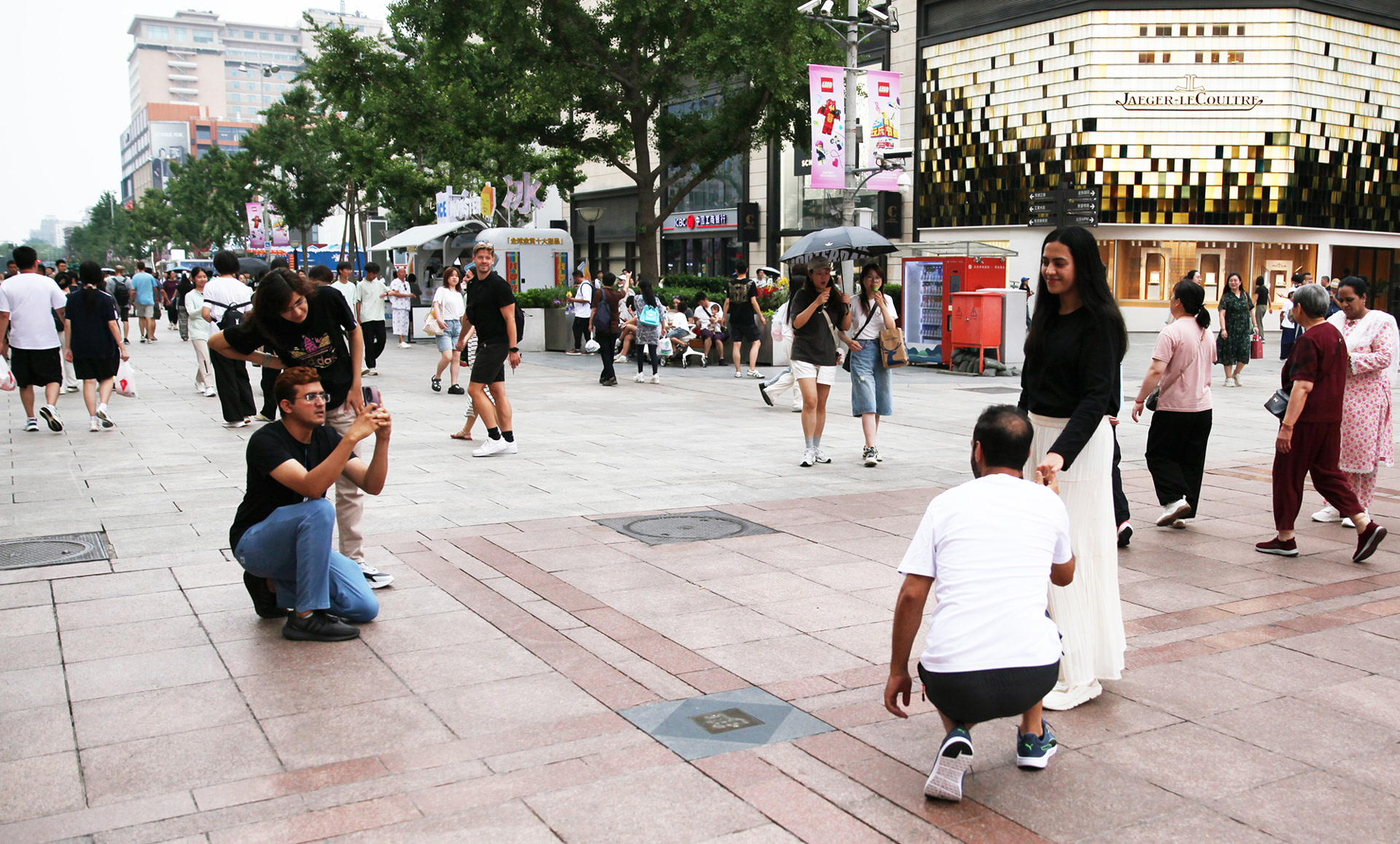 北京是国际化大都市。王府井大街,四位外国青年笑语声高,浮游于喧腾的市声之上。行至王府中环门前,一位年轻男子忽然停住脚步,转身单膝跪落,向着同行的一位年轻女子真挚示爱表白。骤然的举动如投石入水,先是涟漪般的小小骚动,旋即来往行人纷纷让路,只见这位外国女子先是惊喜掩口,脸面如花苞绽放,瞬间染红了面颊,转而显得坦然与自在,脸上漾开会心的笑容。爱意、笑意、善意弥散在空气里,连石子街面也仿佛透出暖意。这条声名赫赫的商街,此刻竟成了异乡情缘的温柔福地。两颗远来的心,安然在此开出爱情花朵。