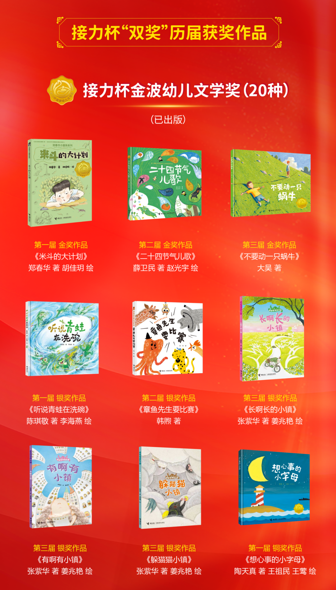 接力杯“双奖”诞生于2017年1月,以金波先生、曹文轩先生两位德艺双馨的艺术家之名命名。奖项的设立宗旨是培养具有全球视野、创新精神和创作实力的幼儿文学、儿童小说新人,发现、发掘新人、新作,为原创儿童文学作家团队注入新鲜血液。历经三届的评选,接力杯“双奖”获奖及入围作品累计出版54种图书,总发行量达156万册,儿歌《二十四节气儿歌》、图画书《章鱼先生要比赛》、小说《狼洞的外婆》《羊儿在云朵里跑》《假装被风儿吹走了》等21种图书荣获全国优秀儿童文学奖小说奖、金风车国际青年插画家大赛大众选择奖、最佳中华优秀传统文化题材奖、博洛尼亚插画展优胜作品等国内外重要图书奖项。图画书《不要动一只蜗牛》《好想好想吃草莓》、散文《给妈妈的一百万封信》等33种图书输出到美国、韩国、新加坡等 23个国家和地区,输出比例达61%。