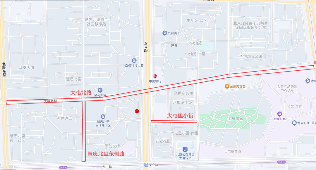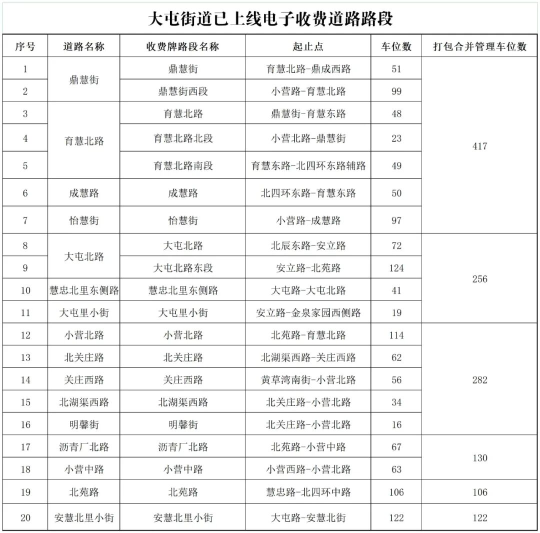 大屯里小街、慧忠北里东侧路、大屯北路(大屯北路、大屯北路东段)3条道路4个路段已打包完成,4个路段256个车位就近共享。