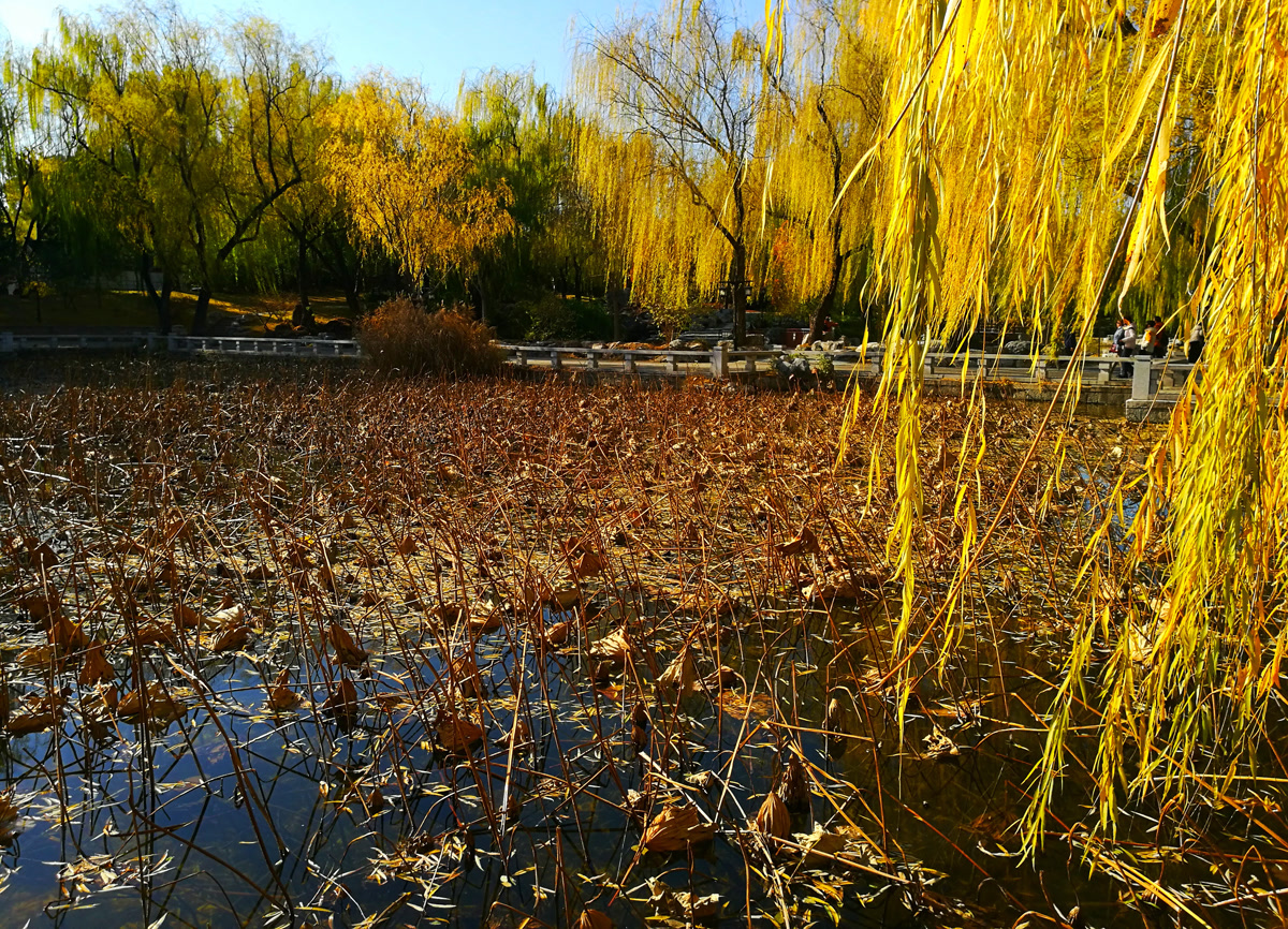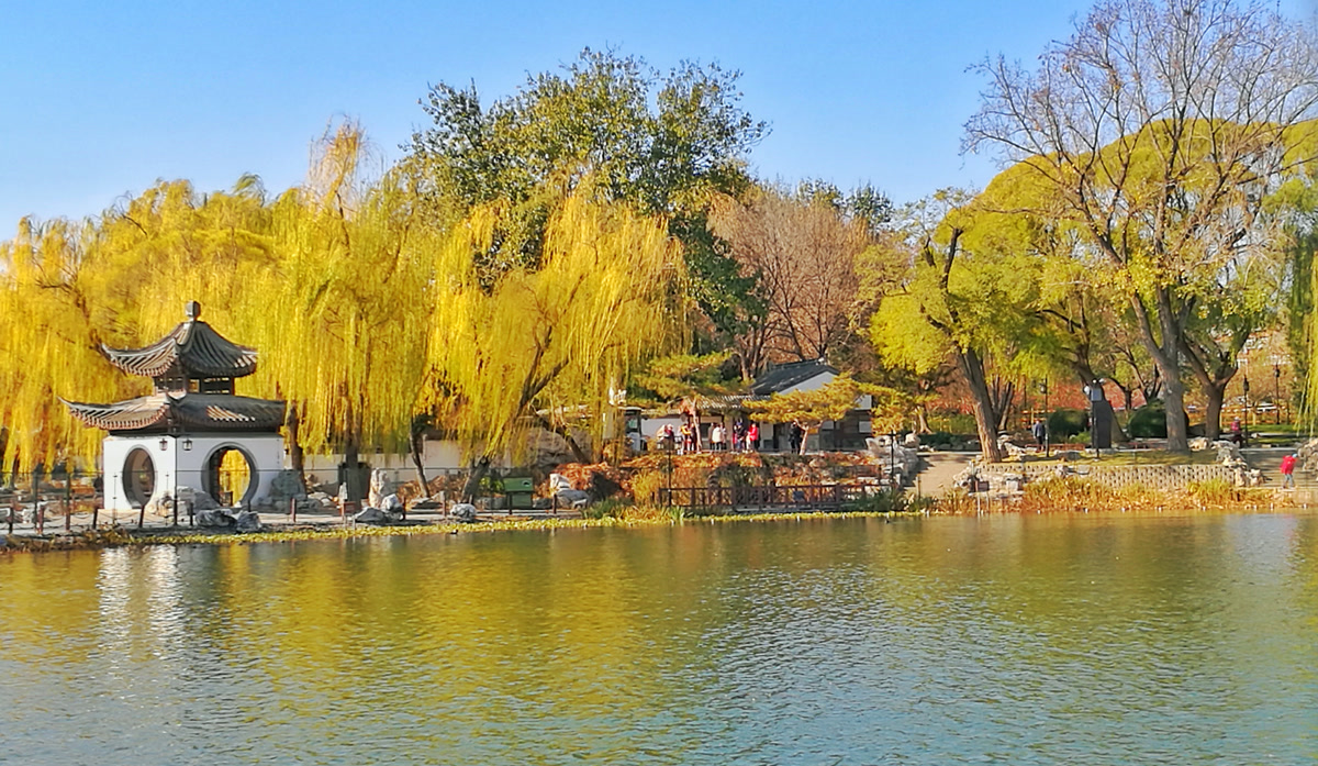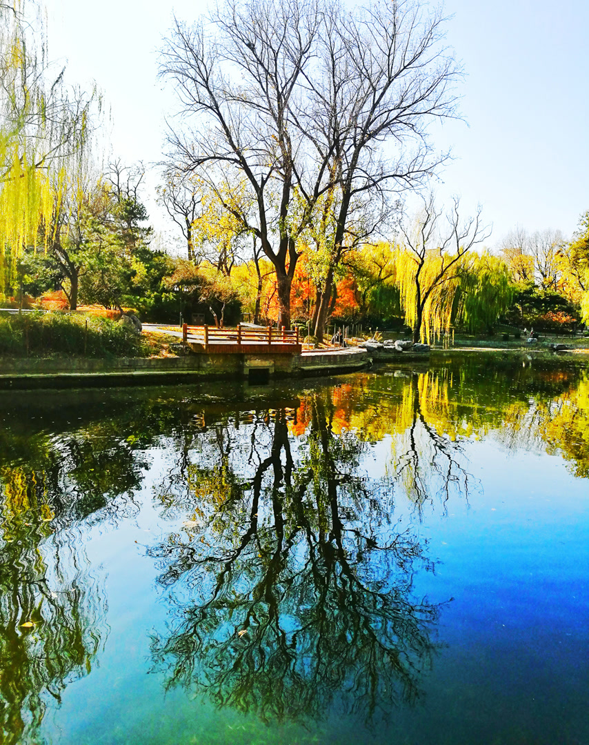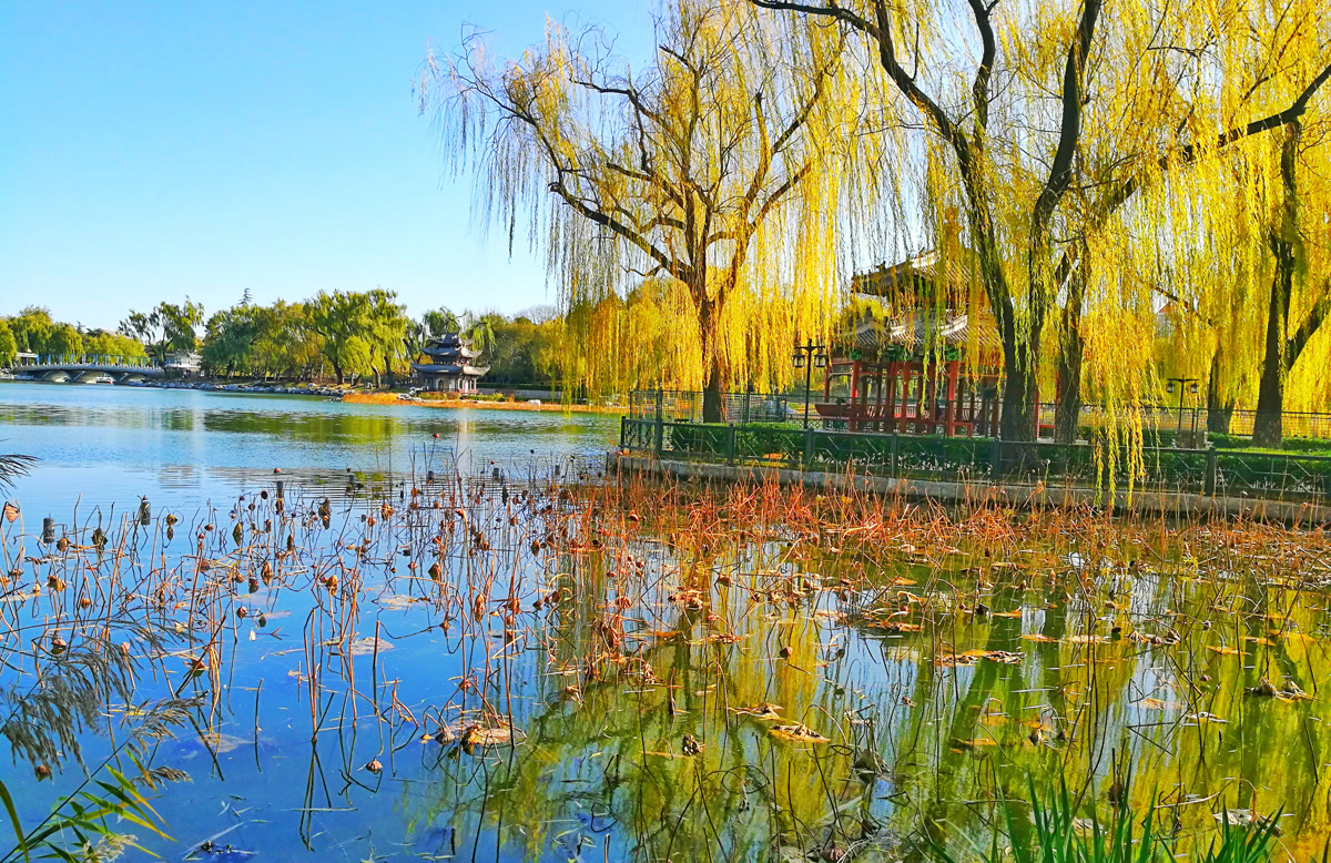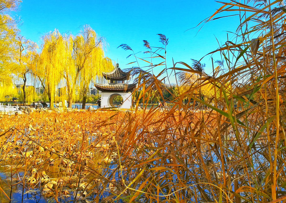 11月18日早十点,我踏进陶然亭公园南门,第一眼就被那片天空钉在原地。那不是普通的蓝,是一种被涤荡掉所有杂质的蓝色。风倒是还有,却完全变了脾气,从前天的“咆哮”变成了今天的“耳语”,轻轻拂过湖面,水波皱起细密的纹理,晃动着亭台楼阁的倒影。阳光毫无保留地倾泻下来,照在慈悲庵的飞檐上,连瓦片都泛着光。澄澈的蓝天像一块巨大的蓝丝绒,把亭台楼阁、垂柳湖面全都衬得明艳动人。湖面平静如镜,倒映着慈悲庵的飞檐翘角,偶尔掠过一两只水鸟,划破这片宁静,却更添生机。