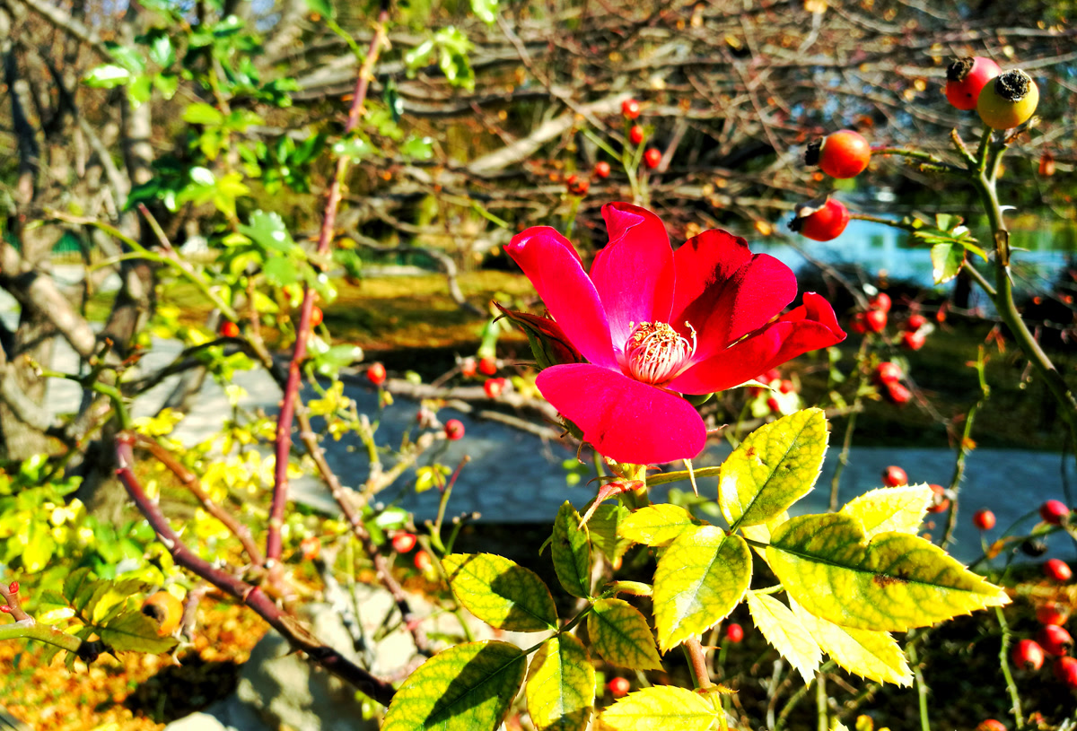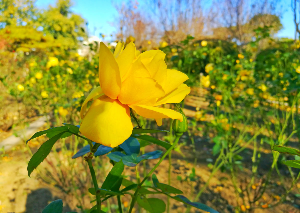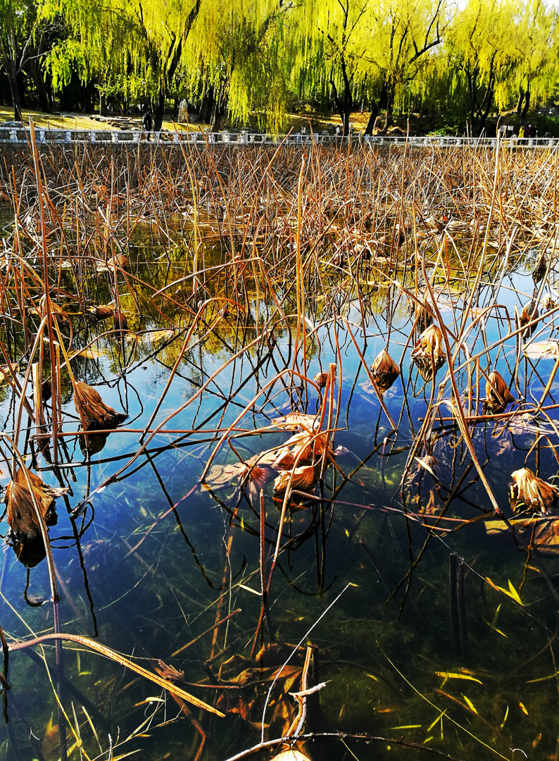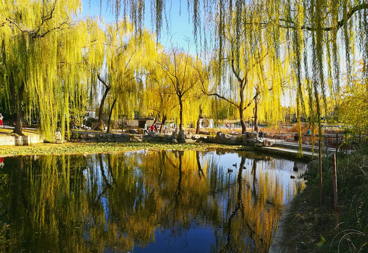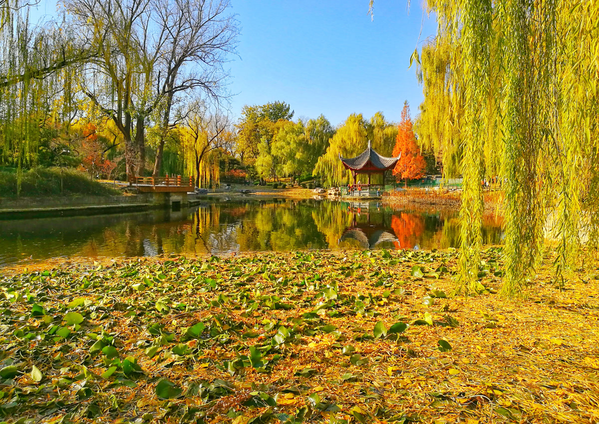 11月18日早十点,我踏进陶然亭公园南门,第一眼就被那片天空钉在原地。那不是普通的蓝,是一种被涤荡掉所有杂质的蓝色。风倒是还有,却完全变了脾气,从前天的“咆哮”变成了今天的“耳语”,轻轻拂过湖面,水波皱起细密的纹理,晃动着亭台楼阁的倒影。阳光毫无保留地倾泻下来,照在慈悲庵的飞檐上,连瓦片都泛着光。澄澈的蓝天像一块巨大的蓝丝绒,把亭台楼阁、垂柳湖面全都衬得明艳动人。湖面平静如镜,倒映着慈悲庵的飞檐翘角,偶尔掠过一两只水鸟,划破这片宁静,却更添生机。