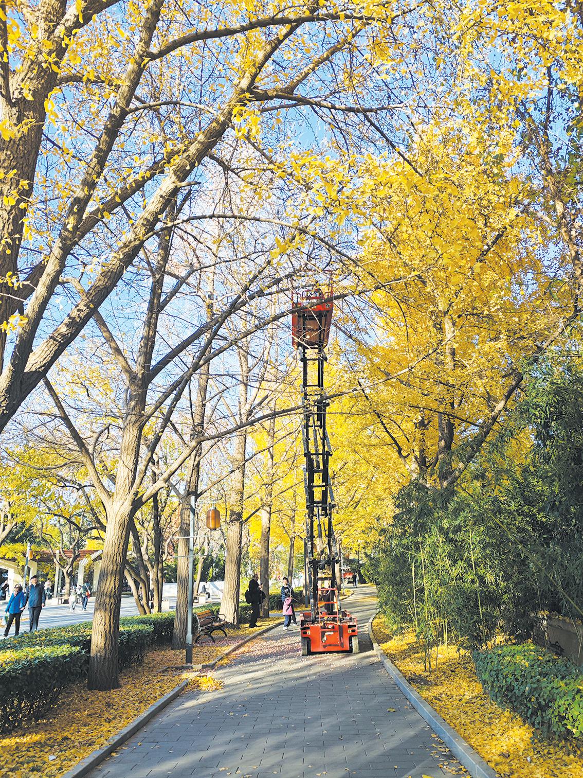 为防止银杏果臭味影响游客体验,11月,日坛公园还进行了手工摘果。“在银杏集中成熟期,工作人员会乘坐升降车,在果实落地之前将其摘下。”但工作人员坦言,这种方式也不能完全杜绝银杏果发臭的问题。