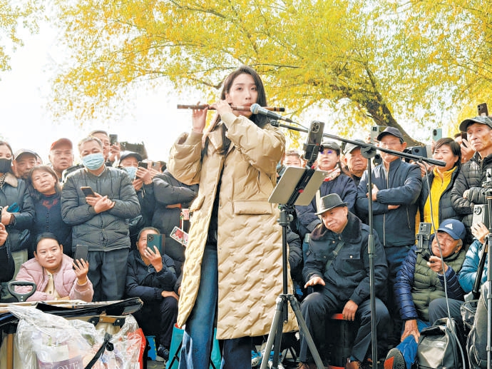 今年“十一”期间,孙楚泊为了拍摄素材第一次前往公园演出。听说紫竹院公园有文艺氛围,她背上乐器包直奔公园里水房附近的小竹林。“本来我还有点社恐,但吹了几首曲子,身边就围满了观众。”孙楚泊回忆,观众会在一曲终了高呼一声“真好”,也会有人积极走上前说“吹个《女儿情》吧。”扑面而来的热情,让最初的忐忑烟消云散,孙楚泊不仅吹自己拿手的曲目,也接受“点歌”,若被点到自己不熟的曲子,她便认真回应:“这首歌我还没学习到位,等我回去练好了,再来给您交作业!”