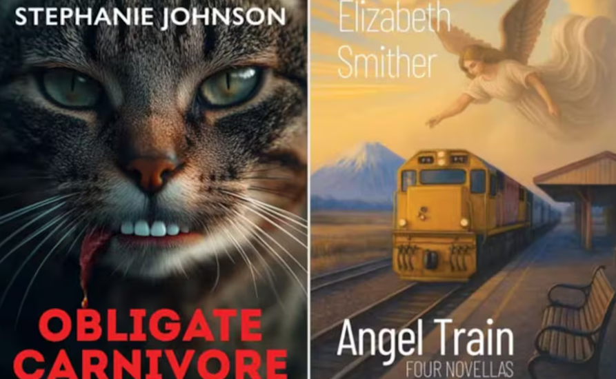 新西兰作家斯蒂芬妮·约翰逊所著《专性食肉动物》和伊丽莎白·史密瑟所著《天使列车》的封面。(新西兰国家广播电台)