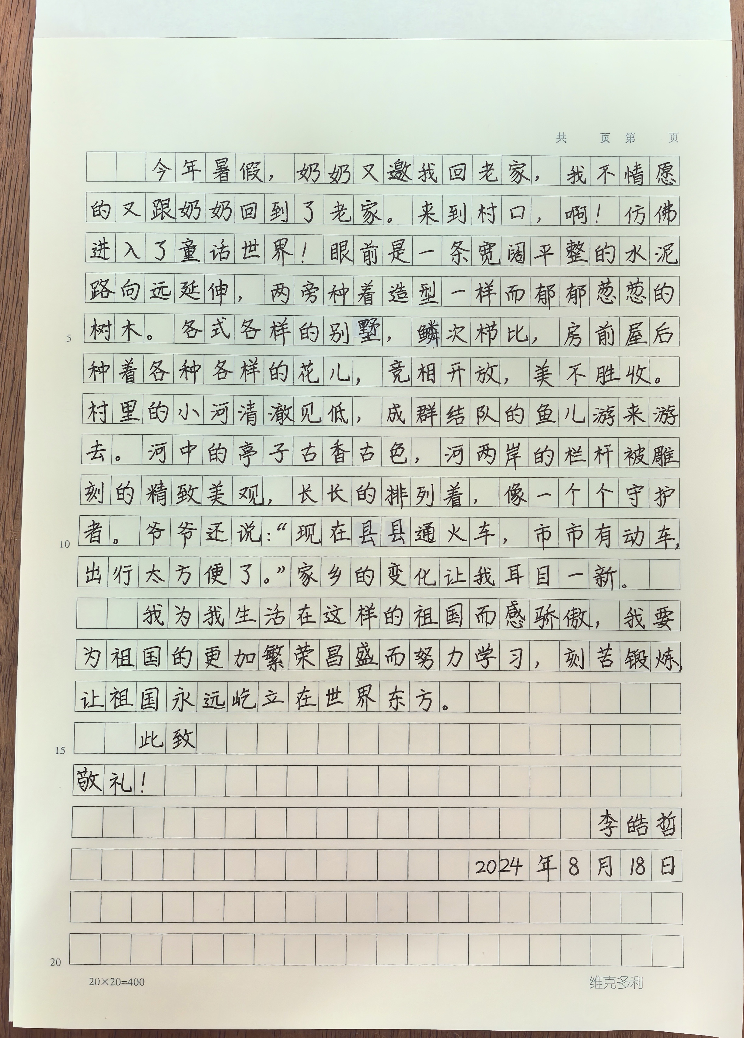 今天这幅AI绘画作品的原型来自清华附中朝阳学校小学部五年级(2)班李皓哲的书信作品《写给祖国的一封信》。