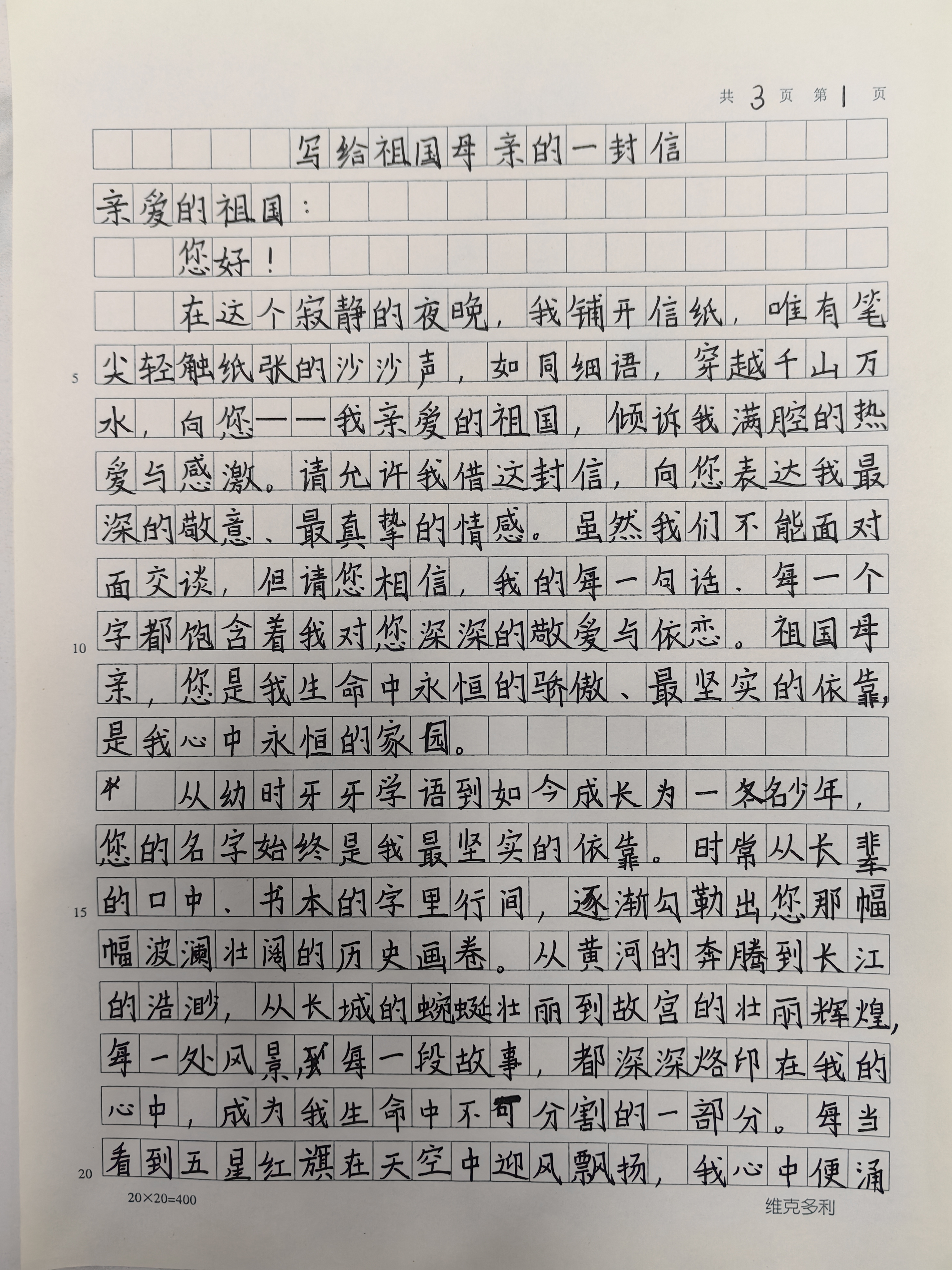 今天这幅AI绘画作品的原型来自北京市昌平区实验学校(郝庄校区)六年级(3)班方梦瑶的书信作品《写给祖国的一封信》。