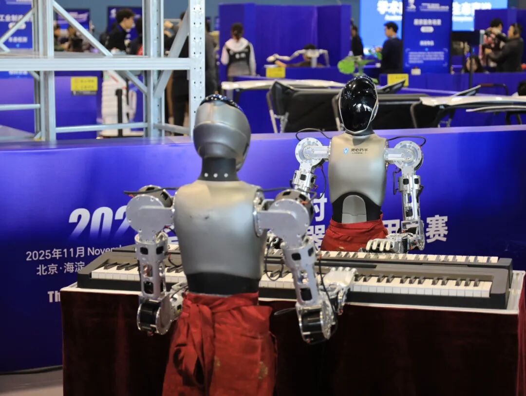 赛场一侧,灵心巧手(北京)科技有限公司“灵心乐府机器人乐队”正在倾情演奏。“这手指的灵活度,简直和真人弹奏没什么两样!”一位年轻观众举起手机,边录像边感叹。