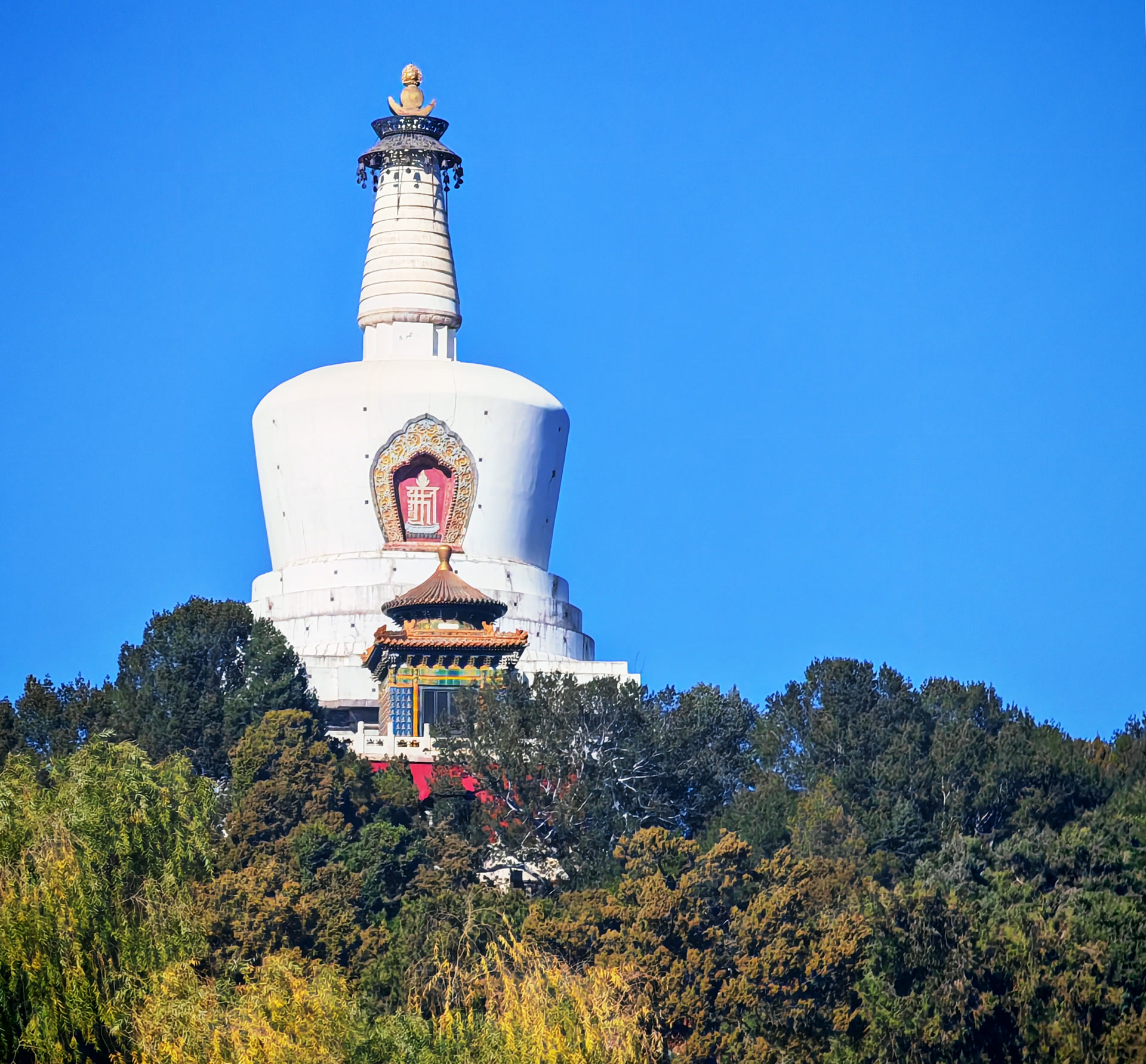 北海白塔又称永安寺白塔,是一座藏式喇嘛塔,由塔基、塔身和塔顶三部分组成,高35.9米,塔身立于白石须弥座上,呈覆钵式,最大径14米,正面有壶门式眼光门,内刻藏文咒语。塔身上部有细长的相轮(又名十三天)和铜质华盖,最上为婆金火焰宝珠塔刹,整个塔身有306个通风孔。