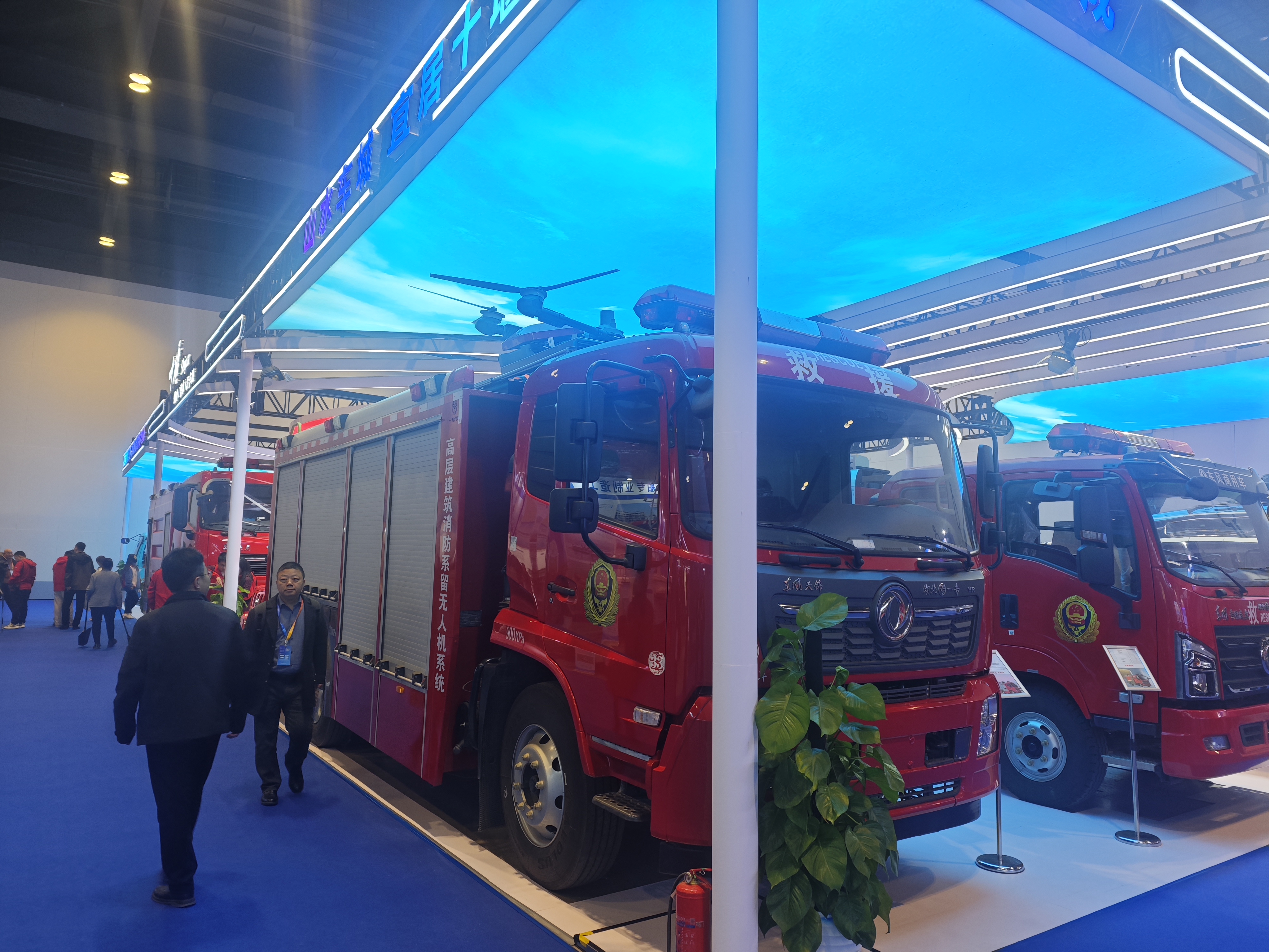 湖北一专汽车展出的高层建筑无人机消防车同样备受关注。这款今年研发的新车型配备了高性能无人机,无人机携带水带可以快速爬升到150米高空。湖北一专汽车总经理余雄利指着车顶的无人机告诉记者:“常规状态下无人机存放在车厢内,车辆到达指定地点后,车顶盖板打开,升起无人机,3分钟内各项工作就可以准备就绪。整个车辆可以携带约5吨水,通过无人机携带的水带,可以对高层建筑实现精准灭火。”此外,针对山林火灾,无人机还可以携带4枚消防弹实施远距离精准灭火。目前,这款应急车辆已获得一百余个订单。“第一次参加应急装备专业性的展览,北京资源较多,希望对接到更多客户。”余雄利说。