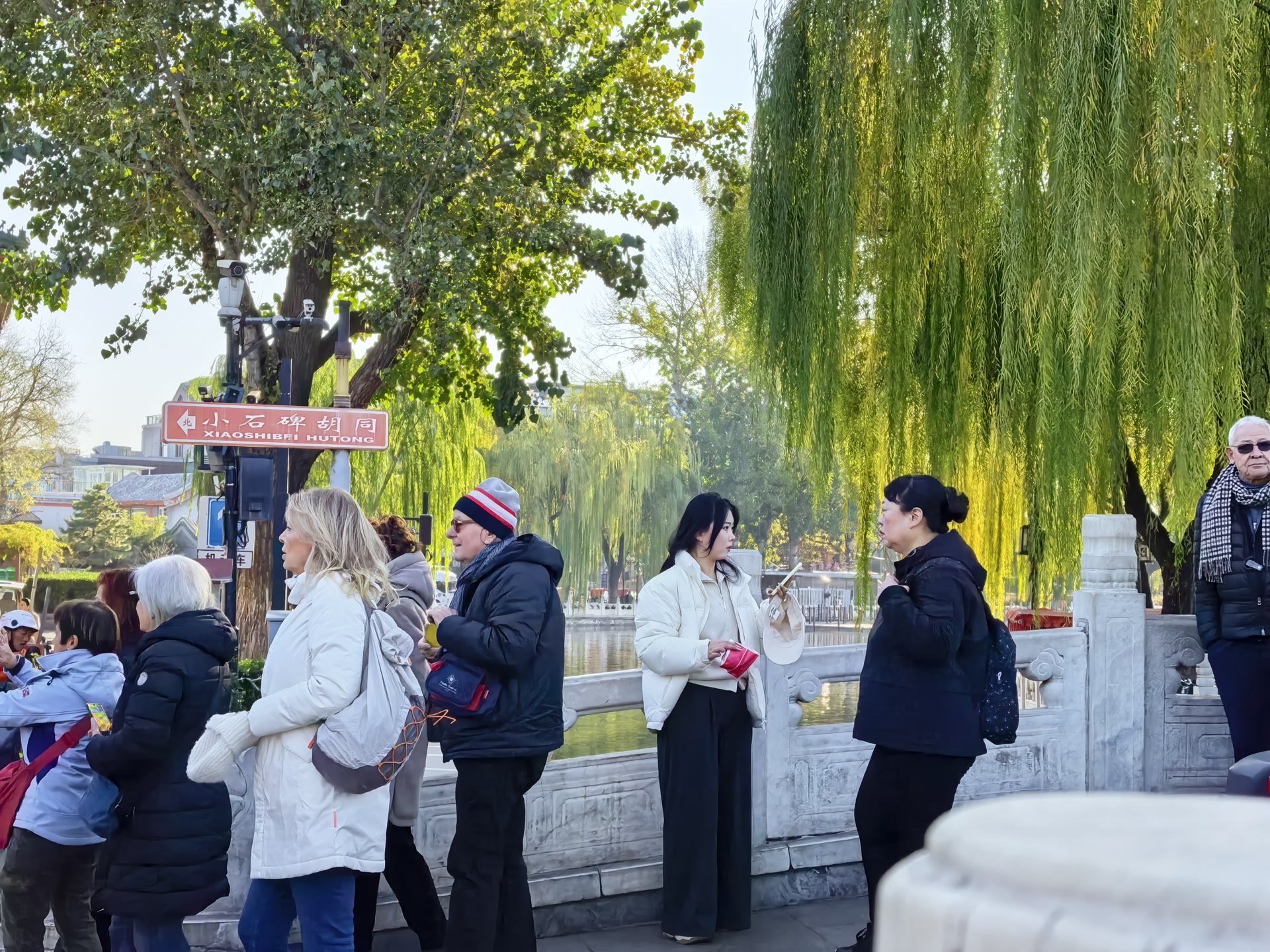 过了桥,沿着后海北沿缓缓而行,游人确是渐渐多了起来。有举着糖葫芦、嬉笑着跑过的孩童;有互相搀扶着、白发苍苍的老夫妇,用我半懂不懂的京片子,絮絮地说着家常;也有的游客举着手机,贪婪地捕捉着眼前的光与影。空气里混杂着糖炒栗子的焦香、路边小吃摊的油烟味,以及水边特有的、那股微腥而润泽的气息。这一切,构成了一片嗡嗡然的、充满生命活力的背景音。