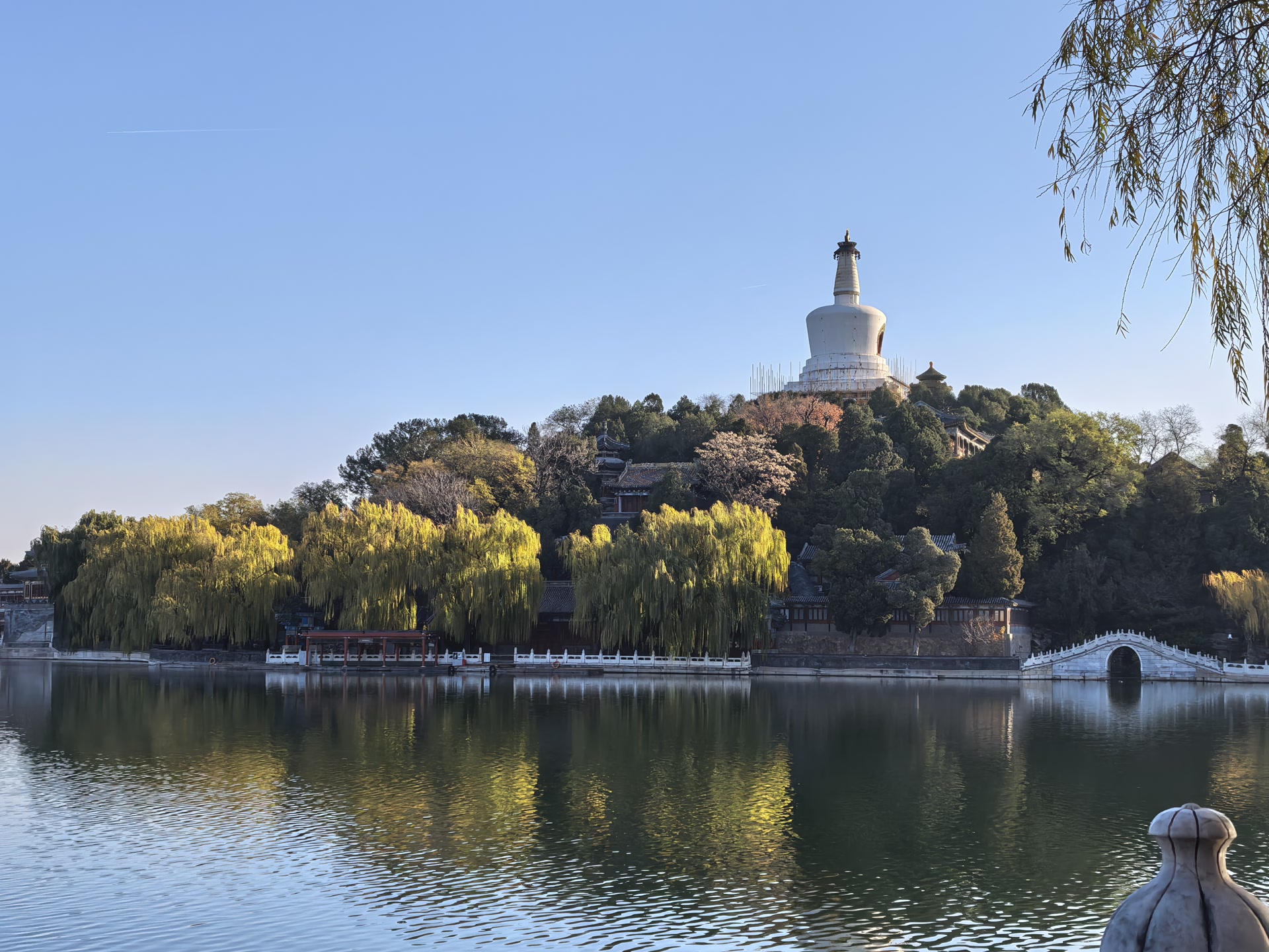 信步走着,不觉已到了水边。我的心,便在这一瞬间,被那一片水绿攫去了。这北海的水,今日是出奇的静,出奇的绿。那不是一望无际的、浩渺的绿,而是被四周的堤岸、岛树温柔地环抱着、界定着的一片盈盈的绿。它绿得像一块极大极大的、未经雕琢的翡翠,却又没有宝石那般逼人的宝气;它的绿是内敛的,深沉的,含着些许的墨色,仿佛能吸纳一切的光与声。水面上,那座建于清初顺治八年(1651年)的藏式白塔的倒影静静地立着,不像实体那般有着分明的棱角,而是轮廓微微地晕开,像一幅年代久远的水墨画,被水汽濡湿了,带着一种朦胧的、梦幻的惆怅。那塔影的白色,浸在这沉沉的绿色里,便成了一抹柔和的、乳白的梦,在水底做着关于前朝旧都的梦。