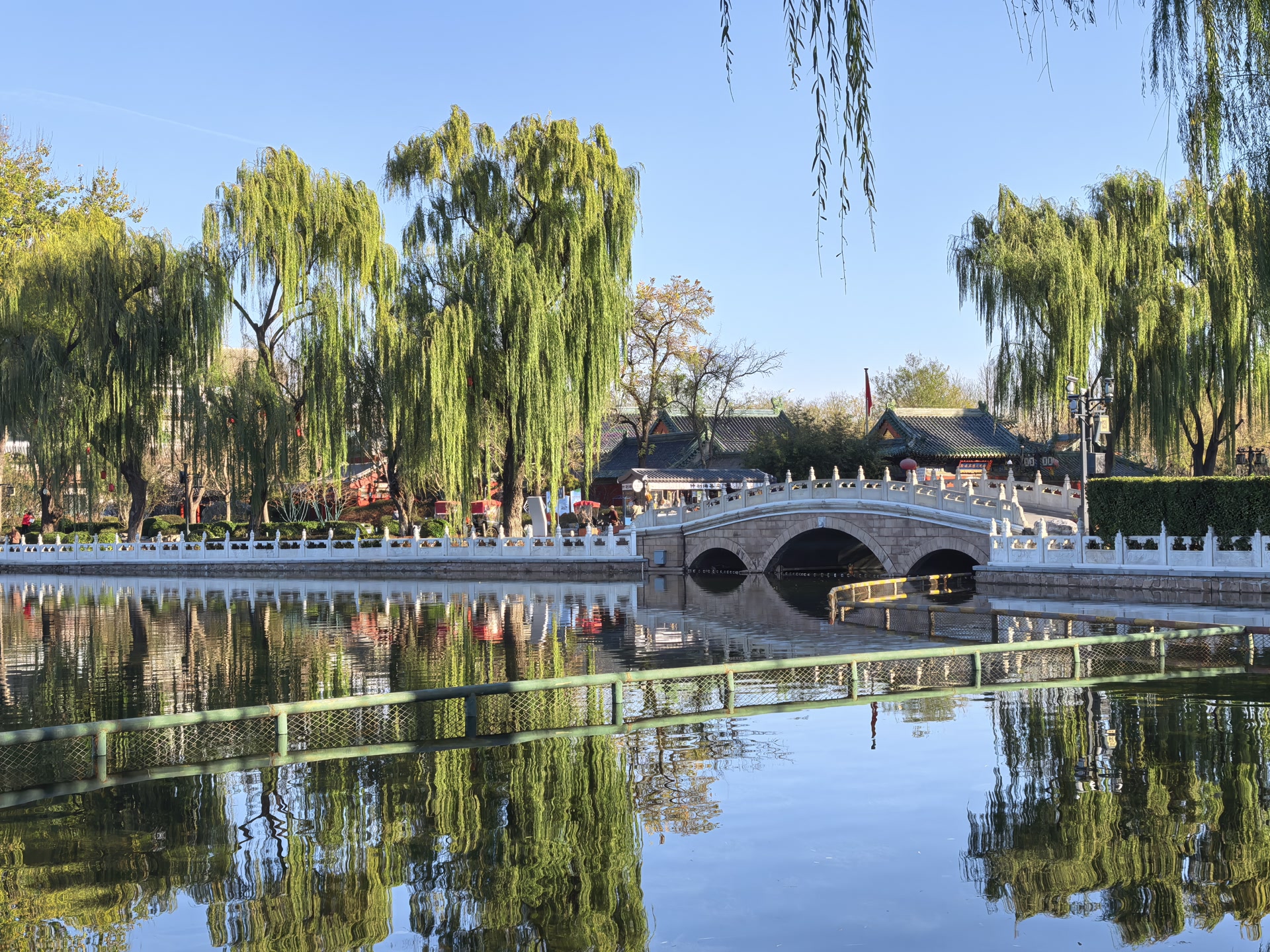 快到小雪节气了,这光是活的,有魂灵的。它不像夏日午时那般白晃晃、硬邦邦的,砸得人睁不开眼;也不像冬日里那般淡薄薄的,有气无力。它是饱满的,温润的,带着一种恰到好处的力量,照在北海公园朱红的廊柱上,那红色便仿佛从百年的沉梦里苏醒过来,暖暖地、厚厚地晕开一层光泽,像陈年的琥珀,内里蕴藏着光阴的故事。它穿过琼华岛上白皮松苍劲的枝丫,筛落下来,便成了无数晃动的、圆圆的光斑,俏皮地印在灰扑扑的方砖地上,随着微风,轻轻地跳着舞。我的影子被这光拉得长长的,斜斜地、淡淡地铺在前面,随着我的步子,不即不离地跟着,像一个沉默的、来自往昔的伴侣。