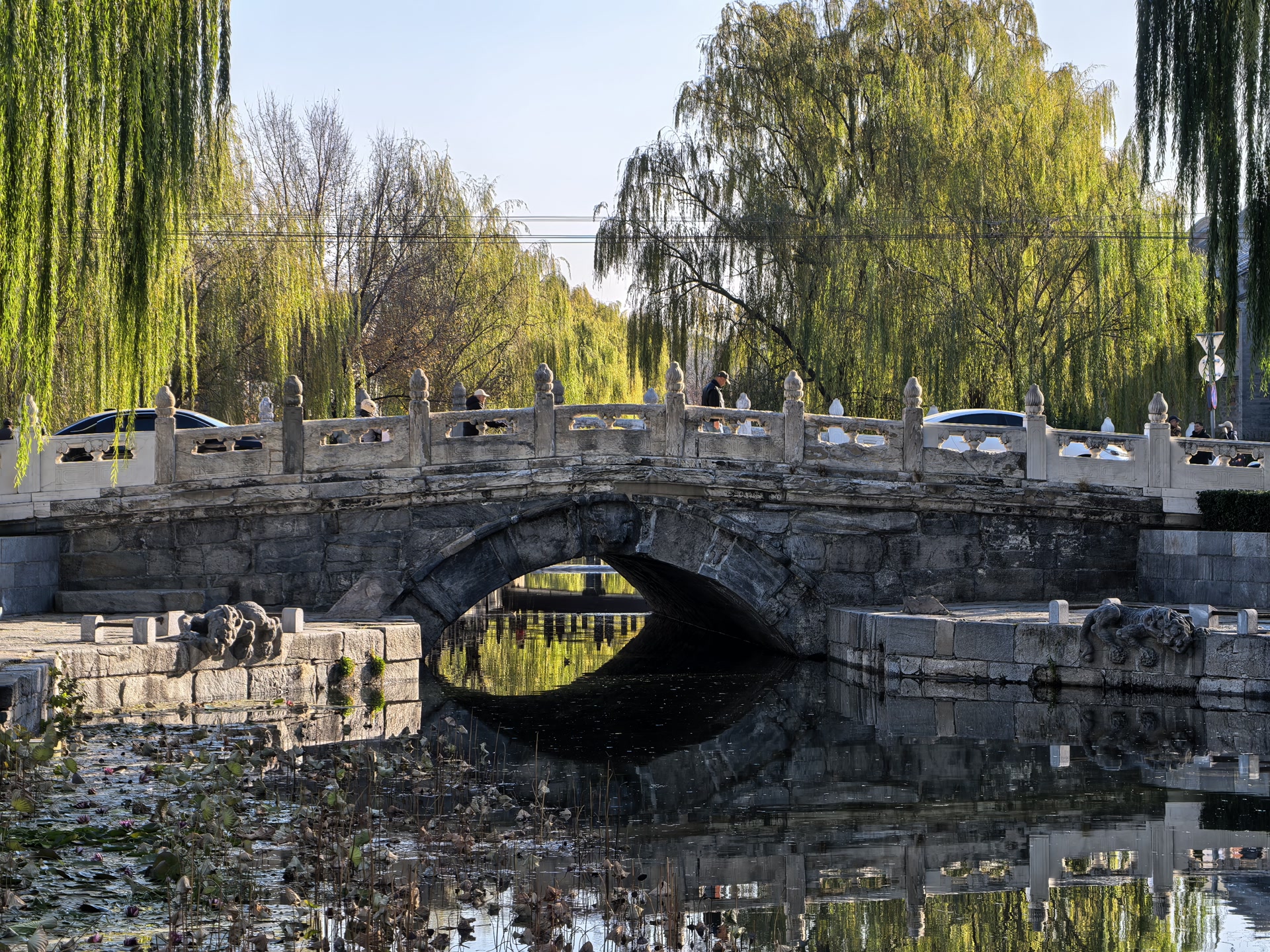 我正沉醉于此,目光下落,便看见了桥头那两只石雕的护卫神兽。它们并非狮子,而是龙之九子之一的“趴蝮”(bāxià),性喜水,常饰于桥畔,寓镇水防灾之意。它们不知在此趴伏了多少年月(虽为重建之桥,石兽或沿用旧物,或仿古新雕,已具风霜),早已被风雨剥蚀得失去了初凿时的锐利棱角,周身布满深褐与青灰相间的苔痕,摸上去,定是粗糙而温凉的。它们不像皇宫门前石狮那般昂首怒目,睥睨一切,而是以一种极其安详的、近乎慵懒的姿态趴着,头颅微微低下,眼神(如果石头有眼神的话)似乎是望着桥下潺潺的流水,又似乎是什么都没望,只是沉在自己的默想里。那份悠然,不像护卫,倒像是两位在自家门口晒太阳打盹儿的、上了年纪的老者,任凭身旁游人如织,脚步杂沓,他们自守着内心的一片清净地与亘古的时光。
