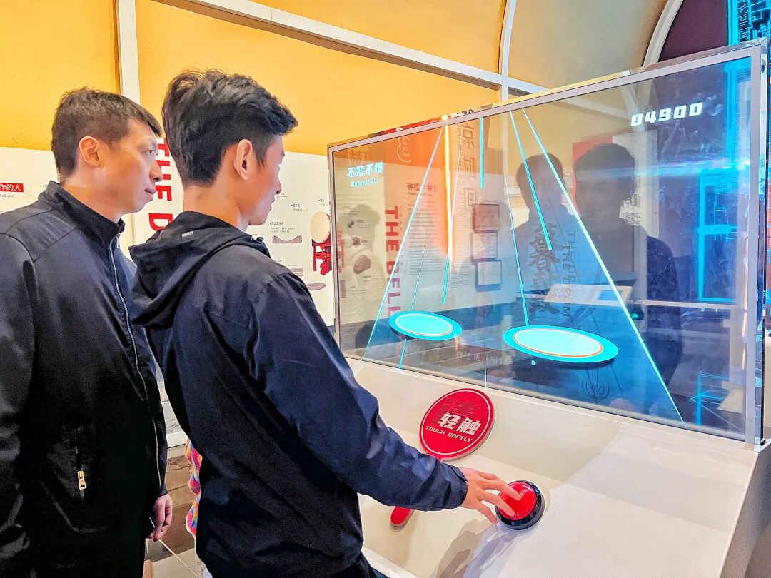 随人流从G口出站,步行约十分钟即可到达鼓楼。如今的鼓楼,早已不是书本中那个刻板的“老古董”。走进一层展厅,“时间的故事”展览正用崭新的方式讲述古老故事。在这里,可以聆听晨钟暮鼓声,也可以在沉浸式光影秀《共鸣》中,感受七百年光阴在墙壁上流动变幻。传统商业街景被生动还原,“卖糖葫芦”“焊洋铁壶”这些源自老北京胡同深处的叫卖声,带着独特的韵调在耳畔回响。一位母亲带着孩子认真聆听那渐行渐远的老北京音韵。最受孩子们欢迎的,当数VR体验区。戴上眼镜,就能跟随屋脊兽“小龙仔”穿越回元大都,亲睹这条中轴线最初的模样……