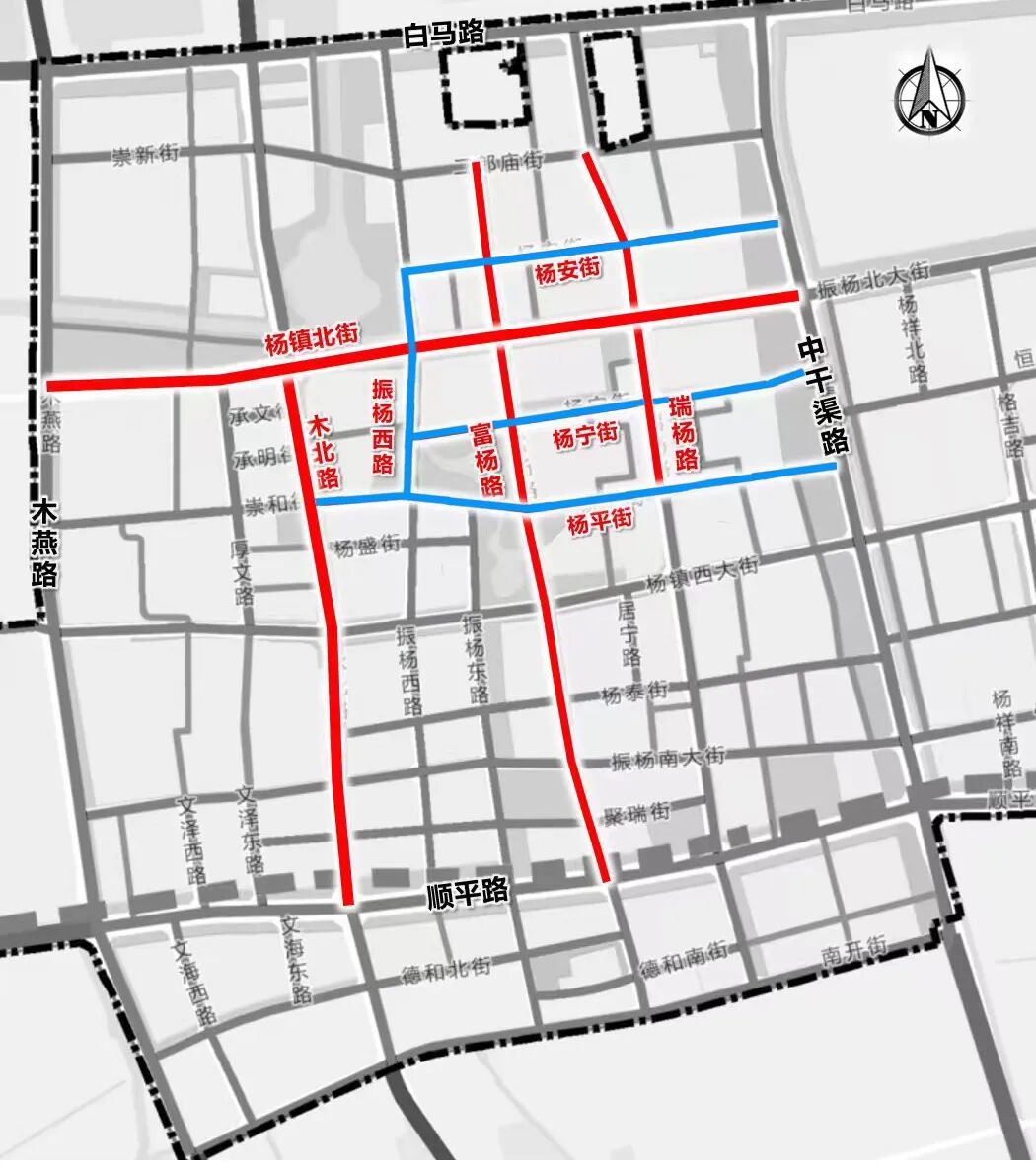 杨平街(木北路—中干渠路)道路施工现场,工人正有条不紊地进行土方开挖、管线敷设、路床换填工作,大型机械与人工协同作业,忙碌而有序。现场负责人张龙介绍:“目前工程正处于地下管线施工阶段。此次建设的4条支路围绕回迁安置房呈现‘三横一纵’布局,与木北路、富杨路、瑞杨路、杨镇北街等主次干路形成‘四横四纵’路网结构,可为回迁居民提供便捷的出行条件。”