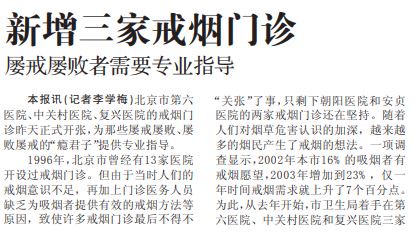 进入新世纪后,随着人们对烟草危害认识的加深,越来越多的烟民产生了戒烟的想法。一项调查显示,2002年本市16%的吸烟者有戒烟愿望,2003年增加到23%,仅一年时间戒烟需求就上升了7个百分点。为此,市卫生局着手增设戒烟门诊。