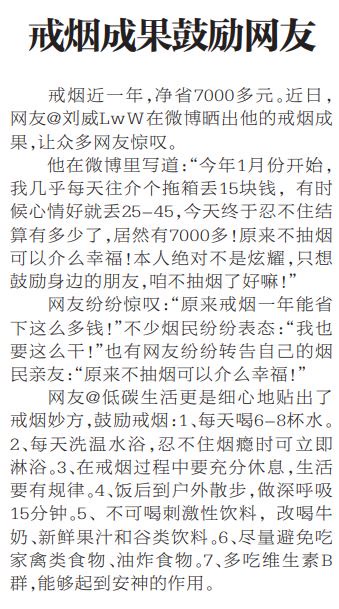 2012年,当发微博还是新鲜事的时候,已经有网友在微博晒戒烟成果,贴出戒烟妙方,鼓励烟民网友戒烟。(2012年12月7日《北京日报》17版,《戒烟成果鼓励网友》)也是在这一年,各种戒烟App出现在手机应用商店里。其中一些受欢迎的戒烟App设计者本身就是“老烟枪”,因而特别了解戒烟的艰辛。“戒烟的人需要正面的鼓励和刺激,打开手机软件就可以随时查看自己戒烟的成果并计算节约的金钱,不是很开心的事情吗?”赵剑飞就是这样设计上线了“戒烟大师”App。而对于“戒烟军团”App的网友来说,每天“打卡、签到”已经成为他们的生活新习惯。App上线两年间,已帮助用户减少吸烟8158万支,“节省金钱”总数约6219万元。(2015年1月30日《北京日报》17版,《戒烟App,也是蛮拼的》)