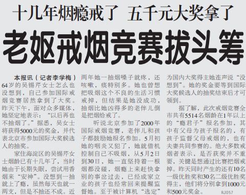 “以后再也不抽烟了。”吴锡芹坚定地表达了戒烟的决心。其实这也是绝大多数参加国际戒烟竞赛的戒烟者的心声。他们都表示,其实是否获奖并不重要,关键是想通过比赛把烟戒掉。(2000年5月31日《北京日报》7版,《老妪戒烟竞赛拔头筹》)