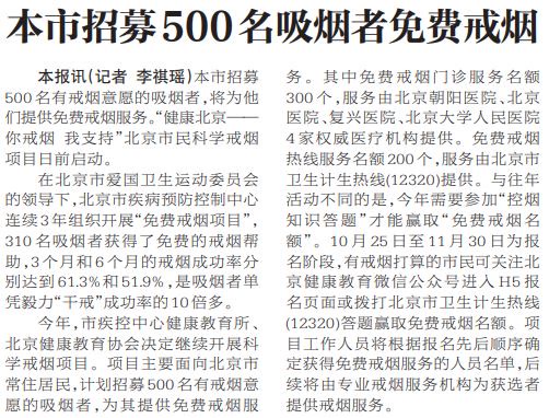 在2017年前后,北京推出市民科学戒烟项目,此后连续多年向有戒烟意愿的吸烟者提供便捷优质的线上免费戒烟服务。2021年,“中国戒烟平台”小程序上线。该平台整合了中国31个省级行政区的权威戒烟资源,戒烟诊所、戒烟热线、戒烟小程序以及微信互助群等触手可及,便于吸烟者选择适合自己且被证实有效的戒烟服务。(2021年5月27日《北京日报》2版,《“中国戒烟平台”小程序上线》)