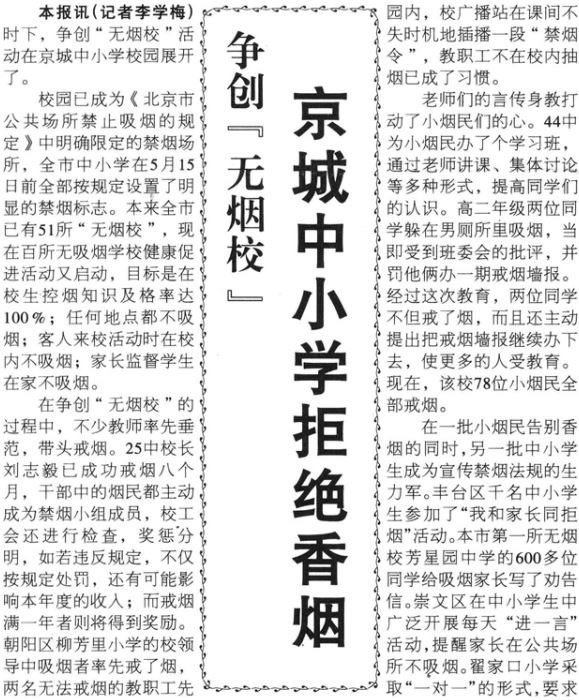 在上世纪90年代蓬勃开展的争创“无烟校”活动中,25中教职工里的烟民纷纷戒烟,并主动成为禁烟小组成员;柳芳里小学原来吸烟的校领导率先戒了烟;44中为小烟民办学习班,通过老师讲课、集体讨论等形式提高同学们的认识,老师们的言传身教打动了小烟民们的心,该校78位小烟民全部戒烟……(1996年5月27日《北京日报》1版,《争创“无烟校” 京城中小学拒绝香烟》)