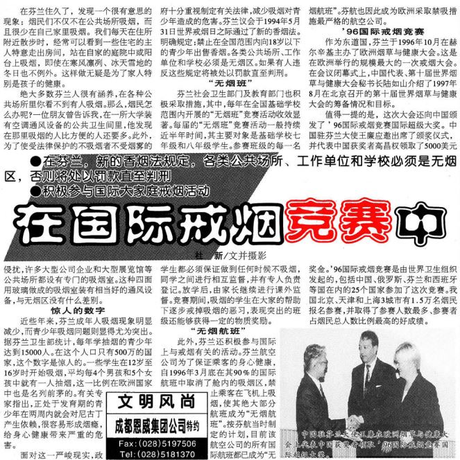 在1996年,北京就和上海、天津一起代表我国参加了国际戒烟竞赛,80%的中国参赛者都得到了家庭、朋友、同事和政府机构及医疗卫生部门的支持。(1997年8月21日《北京日报》5版,《在国际戒烟竞赛中》)