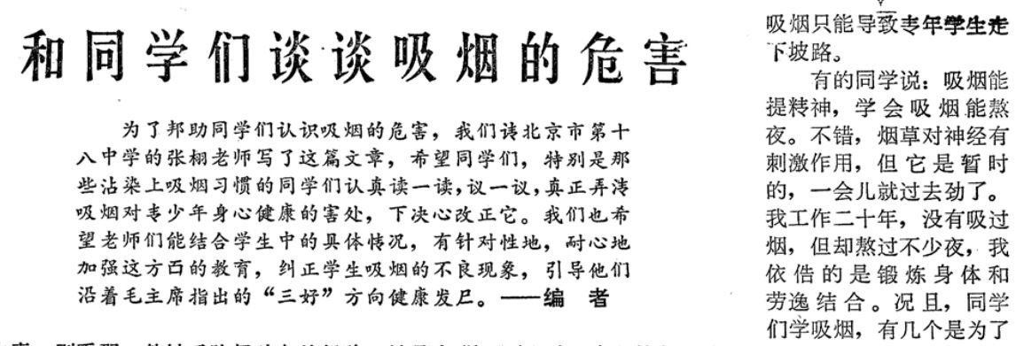 到上世纪70年代末,吸烟对人体健康的危害已经成为世界关注的公共卫生问题。而那时,青少年吸烟也是许多国家头疼不已的社会现象。为了让学生戒烟,北京日报在1978年5月24日3版刊发了北京市第十八中学教师张栩的署名文章《和同学们谈谈吸烟的危害》,通过英雄保尔·柯察金戒烟的生动故事,劝告吸烟学生要像保尔那样以坚强的意志戒烟。北京朝阳医院内科主任翁心植也在北京日报发表署名文章,呼吁禁烟戒烟要从青少年着手。(1978年9月16日《北京日报》3版,《吸烟的害处》)