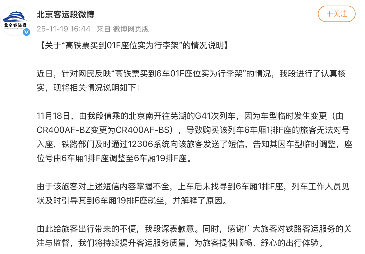 ▶ 高铁票买到01F座位实为行李架?北京客运段回应