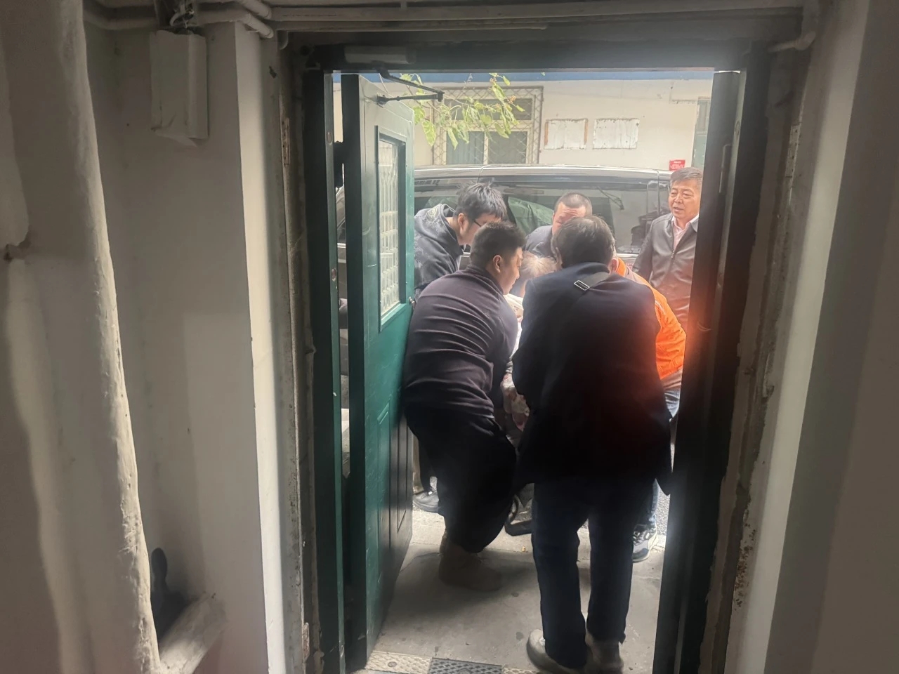 很快,社区工作人员便携带轮椅赶到现场。他们细心地将陈女士从车上扶至轮椅坐稳,并仔细检查了她腿部固定情况。然而,将一位行动不便者从一楼安全抬至五楼家中,是一项需要体力与技巧的挑战。狭窄的楼道内,四名工作人员迅速分工:一人在前方稳住轮椅并主导方向,两人在后方主要负责抬举,另一人则在侧翼保护,防止磕碰。