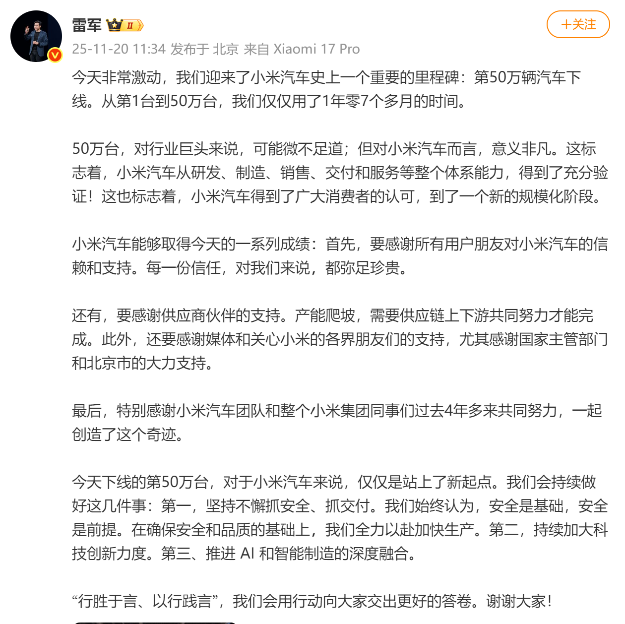 11月20日,小米汽车宣布第50万辆整车下产线。对此,小米创办人、董事长兼CEO雷军在社交平台发文称,从第1台到50万台,我们仅仅用了1年零7个多月的时间。这标志着小米汽车得到了广大消费者的认可,到了一个新的规模化阶段。